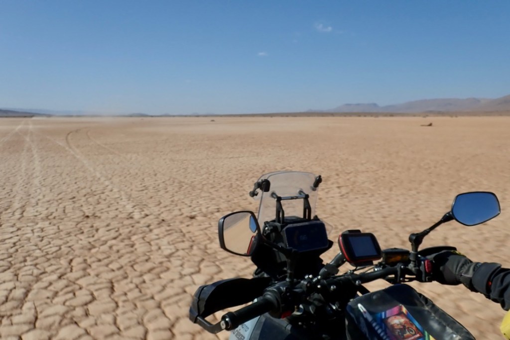 We reversed F2 (or the westbound TMT) from Aouinet Lahna/Torkoz to the road from nowhere which rises over Jebel Rich. Road’s end at KM101.5 in the book is actually more like KM105 (28.3384, -10.3819), just before you plough into the Draa which has been carved back into shape. A good track continues to the gardens at Hassi Delouine. Hereafter grit your teeth for a thorough BLV hiding of around 14km to the stone hut at KM123 by the book where an OUT heads down to the Draa river channel. At this point the eastbound misery relents, or is replaced by sandy tracks which can require commitment on a moto. Presently you get to the heavenly and all too brief Dakar chotts (claypans, below) and then join a new track at book: KM157 28.4090, -9.9134 true: KM156 N28.4090 W9.9134. This track is probably going to Taskala, sat in a gap in the range 14km to the WNW, and not connecting with Hassi Delouine any time soon.
