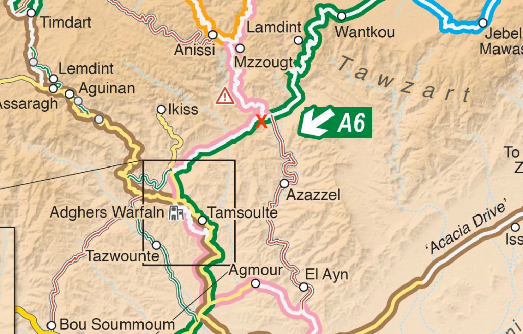 News that A5 / A6 are blocked at 30.19532, -7.41097 – a small oued 1km west of where A5 and A6 meet up at the Oued Anissi riverbed crossing. It’s hard to think this will last long as it’s on the flat exit piste, compared to the gnarly preceding jebel stages on both routes. Or, if it is flood damaged, then further north in the canyons will be worse. If you do get stuck southbound, consider the thin OUT just east of the A5/6 junction (Map, p209) which may lead down to El Ayn (now accessible by tarmac from ‘Acacia Drive’.