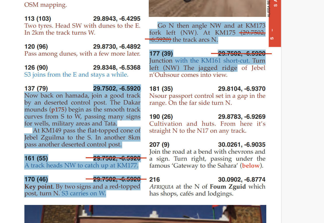 Oh dear. I thought I had a bombproof system for error-free waypoint logging this time round. It was all pasted by mouse directly from the map gpx into Quark, but repetitions and a few distance counting errors slipped in and weren’t spotted. The former I blame my Magic Mouse; it’s done it for years but it’s usually obvious a paste is wrong – not with a near identical wpt. Thanks to Emile B for spotting these in the High Atlas and Saghro. Roll on the reprint.