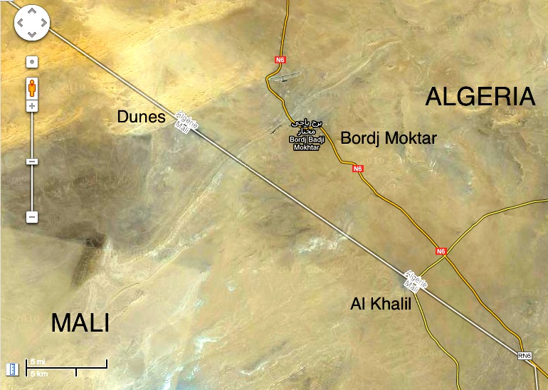 Smugglers and Saints caught my eye as it mentioned al Khalil, a frontier trading settlement that slipped out of the state control around the turn of the century to become a rough smugglers’ entrepôt right on the Algerian-Mali border and just 18km from the Algerian outpost and military base of Bordj Moktar (BBM) on which al Khalil depends. Steele writes in the introduction: