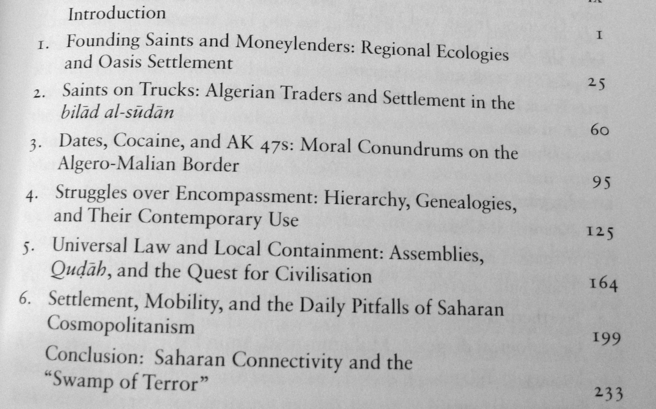 “Most [pre-colonial] settlements in the Sahara are said to have been found by saints, following divine guidance… [it] is always an achievement and relates to larger projects of civilisation, generally bound up in Islamic standards of justice and order. As such it can as easily be swallowed up by moral shortcoming and internal strife as by the shifting sands and greedy raiders”
