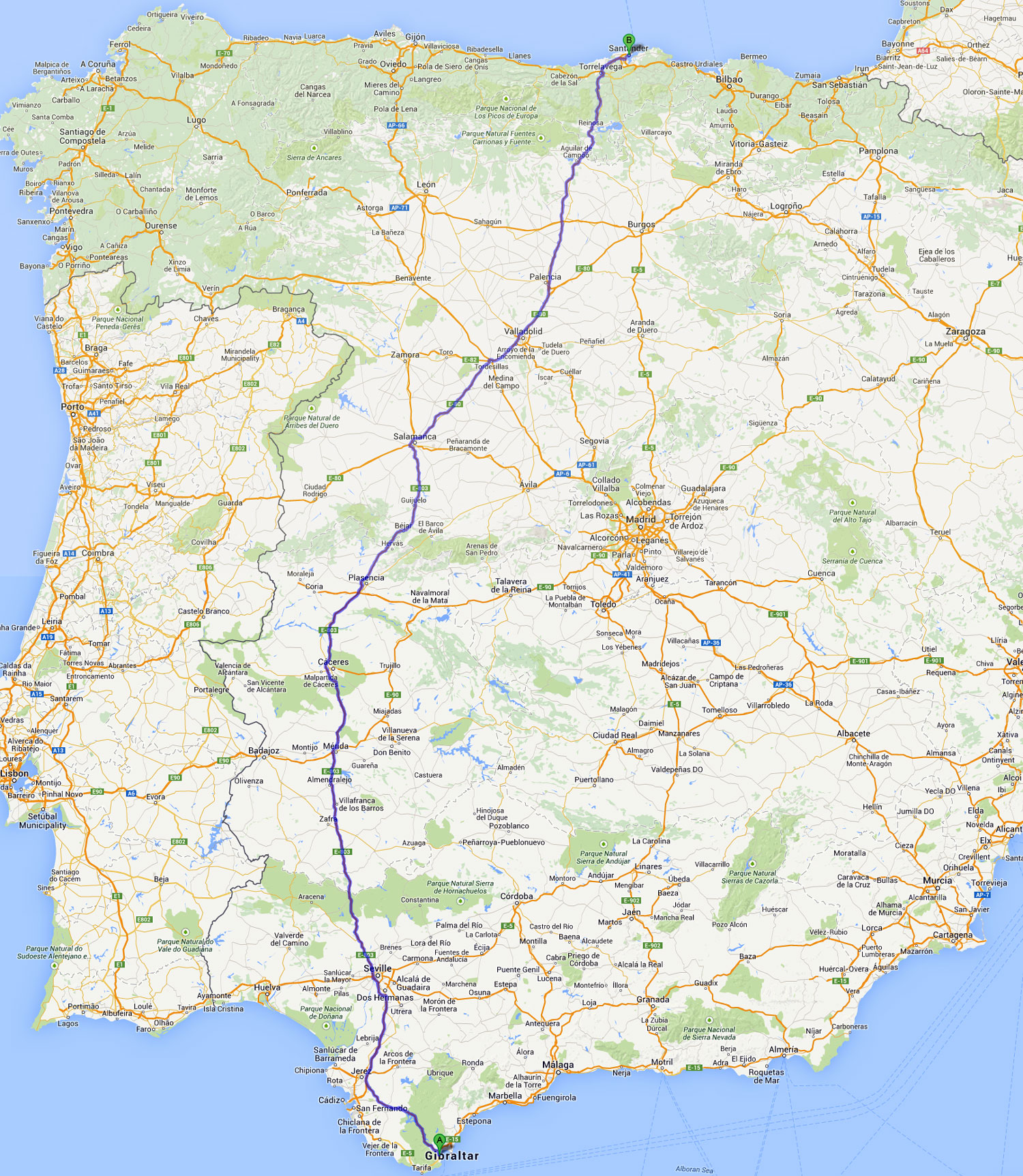 From Santander to Algeciras (the most-used port) is about 1000km, and the empty and fast network of roads west of Madrid (A67, A62, A66 and A381 – right) can get you between the two ports in one long day.