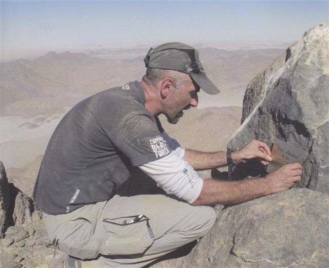Uweinat expert Andras Zboray of FJ Expeditions was part of 2010 trip with Michele and describes their finds here, along with scores of great photos – some of which also appear in the journal. On that occasion Michele and a pal climbed the 1251-metre Cima Marchesi, a peak on the very western edge of the Jebel Uweinat massif (1934m) and therefore well inside Libya, then and now.