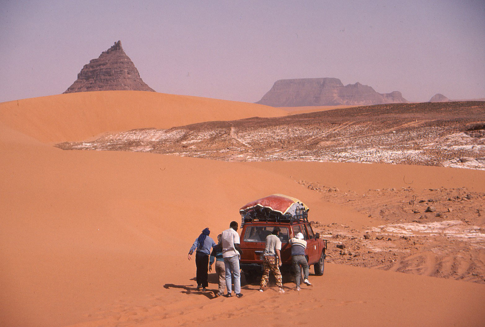 From Ounianga Serir we headed southeast into the region of the Depression de Mourdi, hoping to take a track directly from the north into the Ennedi to Fada. En route we visited another superb lake below an escarpment at Tegguidei, a place not shown on any of our maps. Here a small transient population mine white salt beside the lake, surviving on just one tiny mosquito-infested pool of fresh water. Nobody was here in early March, but we saw the grain stores and evidence of recent visitors.Just after the lake we became hopelessly bogged in deep orange sand below a jagged black spire of rock. Travelling on southeast we reached Demi, another small settlement, again set below spectacular outcrops. Here a very reticent and unfriendly population ekes out a poor existence, mining red rock salt. The people claim to be not Tubu but Gorane, and absolutely refused to let anyone even so much as get a camera out.