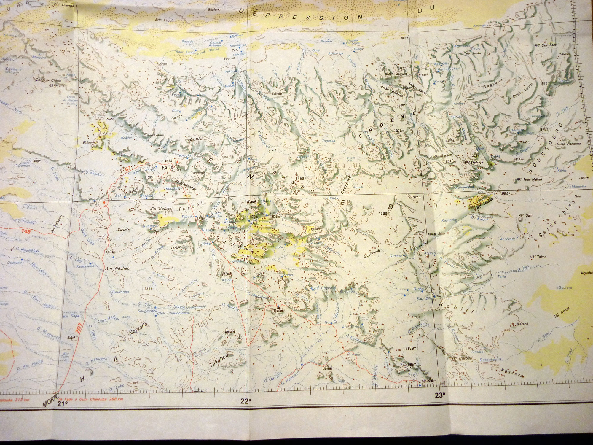 The trip covered several of the Ennedi highlights, including Guelta Archei (3 nights), Puit de Tokou (2 nights), Guelta Bachekele (noted as ‘Ba Chekele’ on the 1974 IGN 1:1m NE34‘ Largeau’ sheet – top left, click to enlarge), 4 nights, Monou, Rocks of Terkei (2 nights), Guelta Deli, Baki and then returning to Fada. We travelled about 5-6 hours a day but spent several days at some sites. The weather was excellent, with only 2-3 days of quite strong wind. Food for the trip was basic, based on variations of spaghetti, rice, sardines, dried tomatoes, onions and tinned peas.
