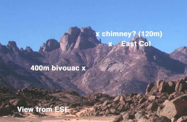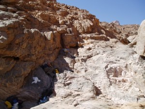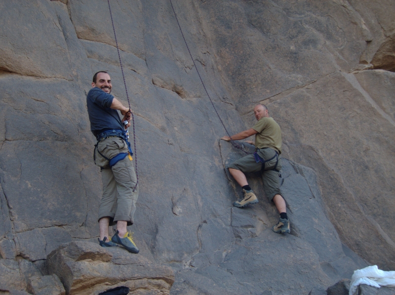 We loaded up and set off around dawn, up the boulder-chocked east oued, hoping we were following an Italian route description I’d found in a climbing magazine. It quickly reminded me of our attempt on Jebel Uweinat early in 2004 where the broken terrain at the end of a much longer approach walk wore us down. Here on Garet, we were soon hogging the shade, detesting our overnight backpacks and stopping for breathers every 20 mins. Clearly our recent colds and lack of exercise on other mountains was having an effect, added to the suspicion that this was not going to be the pleasingly videogenic cakewalk we’d imagined.