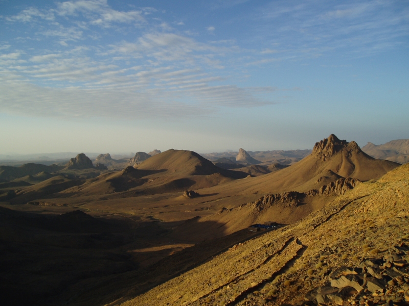 We headed up to Tahat (2908m), Atakor west side, for a warm-up slog into the Saharan Death Zone. It should have been an easy walk but luck – or was it the djenouns? – was against us. Lots of rain in 2005 and amazingly streams were still running out of the Hoggar. Tahat base camp we could have made at a pinch, but on up to Assekrem was washed-out (never easy at the best of times). Not wanting to lose time, we grabbed a few shots, scooted back to town and took the regular way up to Assekrem for a cozy night in the lodge and the dramatic sunset/sunrise.