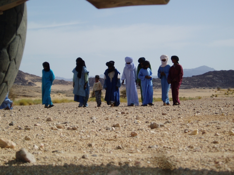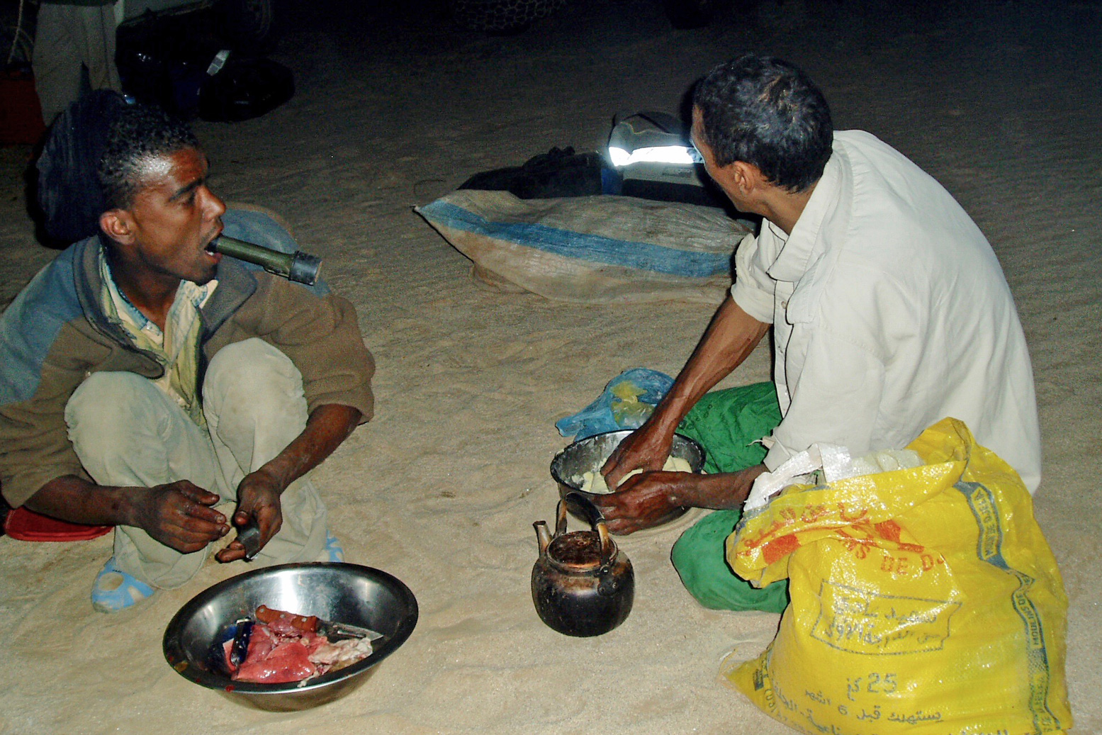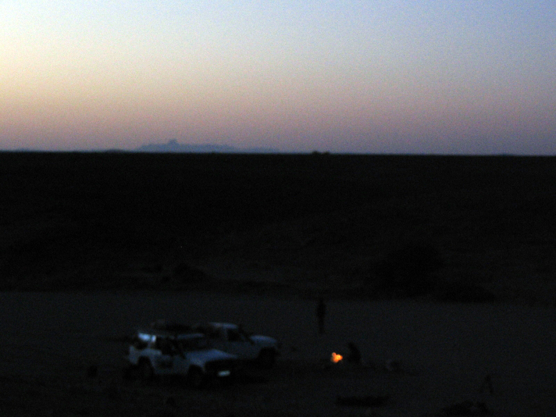 Next morning we headed for the reliable nomad’s wells on the edge of the Gharis or Immidir escarpment in whose canyon’s Group 1 of the 2003 hostages had been stashed and then released in a raid. We had a good wash at the Tabariq well as a quick rain shower passed over, let some nomads use the Thuraya sat phone to get their tea on, and that night, halfway to the Foum Mahek fuel dump, the far distant profile of Garet loomed in the dusk, like a passing submarine. The djenoun were not finished with us yet.