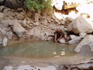 So we bounced back down from rock to rock in half the time, picking up what we’d left on the way. There were a few gueltas, and next time I’d take a chance and tap them with a good water filter to save carrying the stuff. Back at the base camp it was getting dark and our water hadn’t been delivered, although there was a pot of still-warm rice. After a breather we loaded up and hiked back to the cars in the dark. Turned out the well on the far side wasn’t usable and now water was a priority.