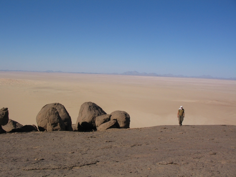 As on Uweinat, water was the problem, along with the fatiguing terrain. Here, I did not want to take a similar chance and plough on regardless to the point where we’d run out of water and food to stagger back. A braver attitude perhaps, and one that can get results, but the reality of an accident up here would be tiresome at the very least; knowing when to turn back was something I’d learned on my first Saharan trip. Better to accept it as a recce and use what time we had left to nip up north to the equally intriguing Amguid crater trek.