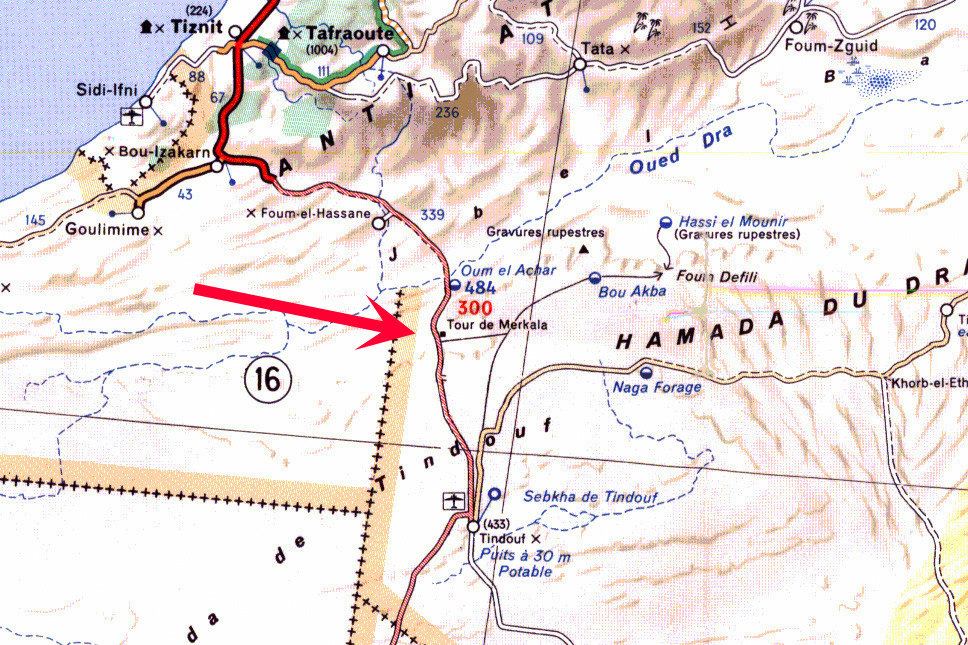 I’ve always been curious about the Tour de Merkala, identified on the Michelin 741 Sahara map (and left) on the Algeria-Morocco border, south of Foum el Hassan.