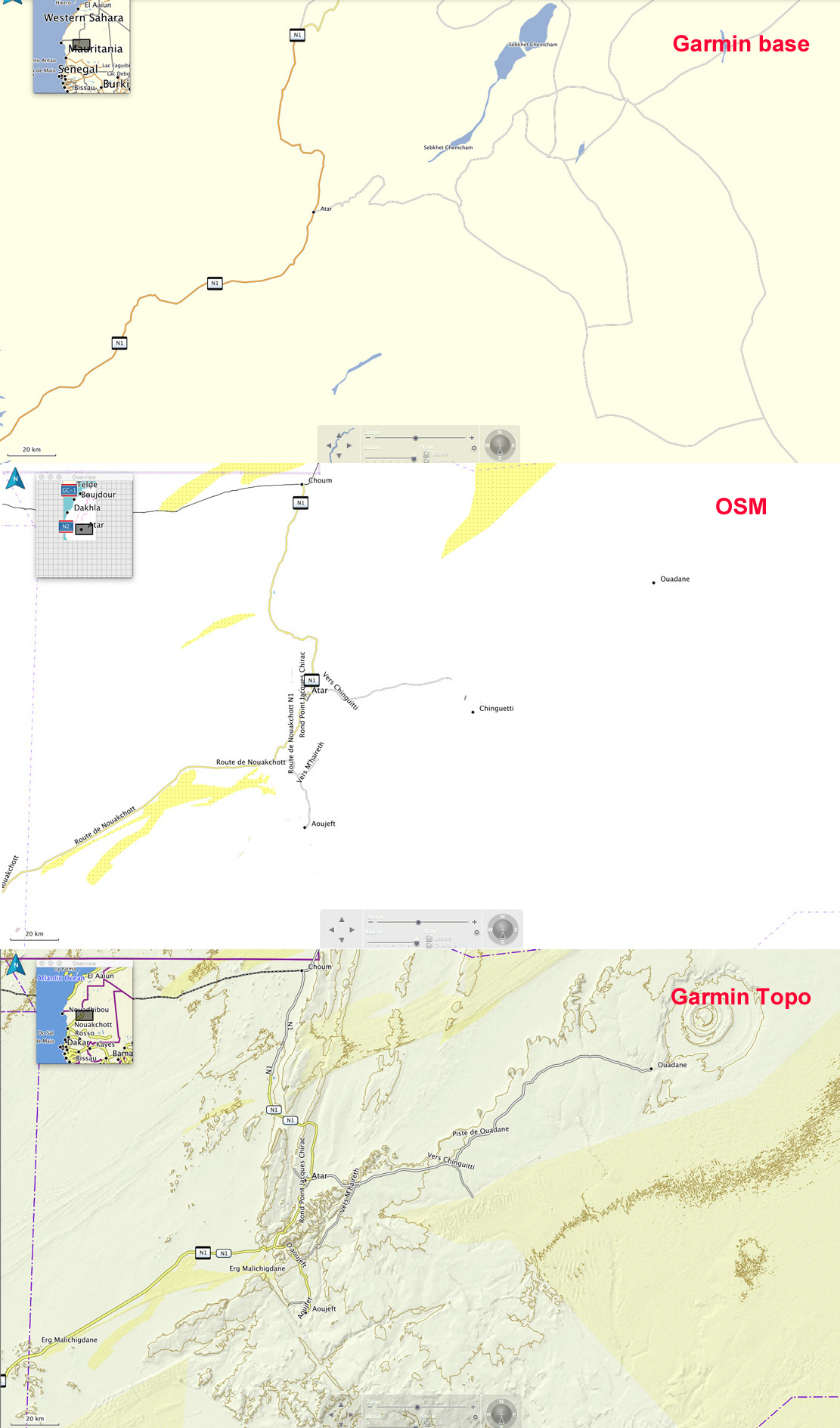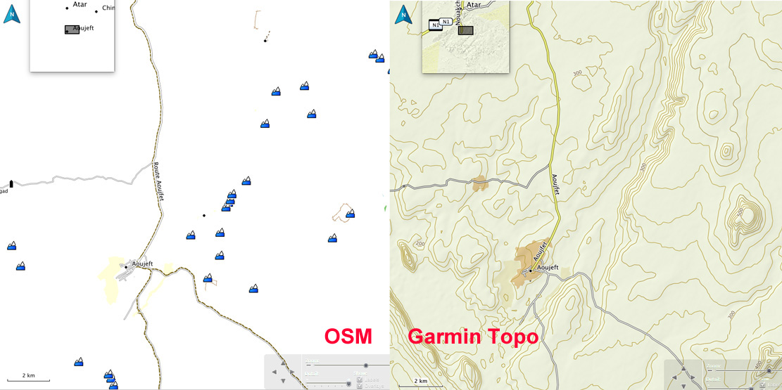 Look at the Atar region (RIM) above right – an area of escarpments, canyons and dunes – all are reasonably accurately shown on the Garmin Topo. There’s an anomaly on the Topo map on the left (bottom panel) in that the (presumably automatically recorded) elevation variation in dunes depicts them as lots of small hills (which in a way, they are), but only once they’re above a certain height. Identifying dunes with contours is not helpful nor a cartographic convention. Shade and colour is best.