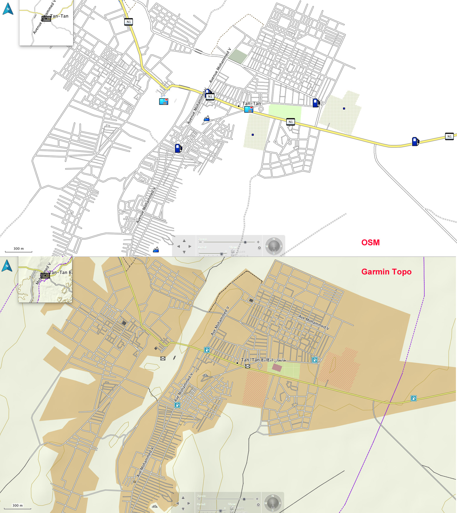 Occasionally at village level the OSM’s street-by-street detail is better, but that’s hardly vital. In towns and cities the extra shading distinguishes the Garmin from the plainer OSM, as shown for Tan Tan, left.