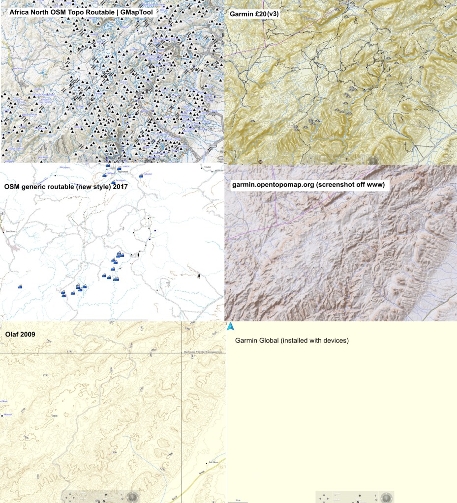 Even though in 2021 old Olaf from 2009 still measures up well, the similar topographic detail of the Garmin means it’s well worth £20, certainly over the plainer, but also free OSMs. In 2018, following a refurb/repair of my Montana, the v1 2016 version of this map was lost or could not be reloaded. I had to buy the v3 version for another £20. A quick scan shows that not much changed, but if it has (based on OSM user updates), it will be in Morocco – the place where most users of this map will visit.