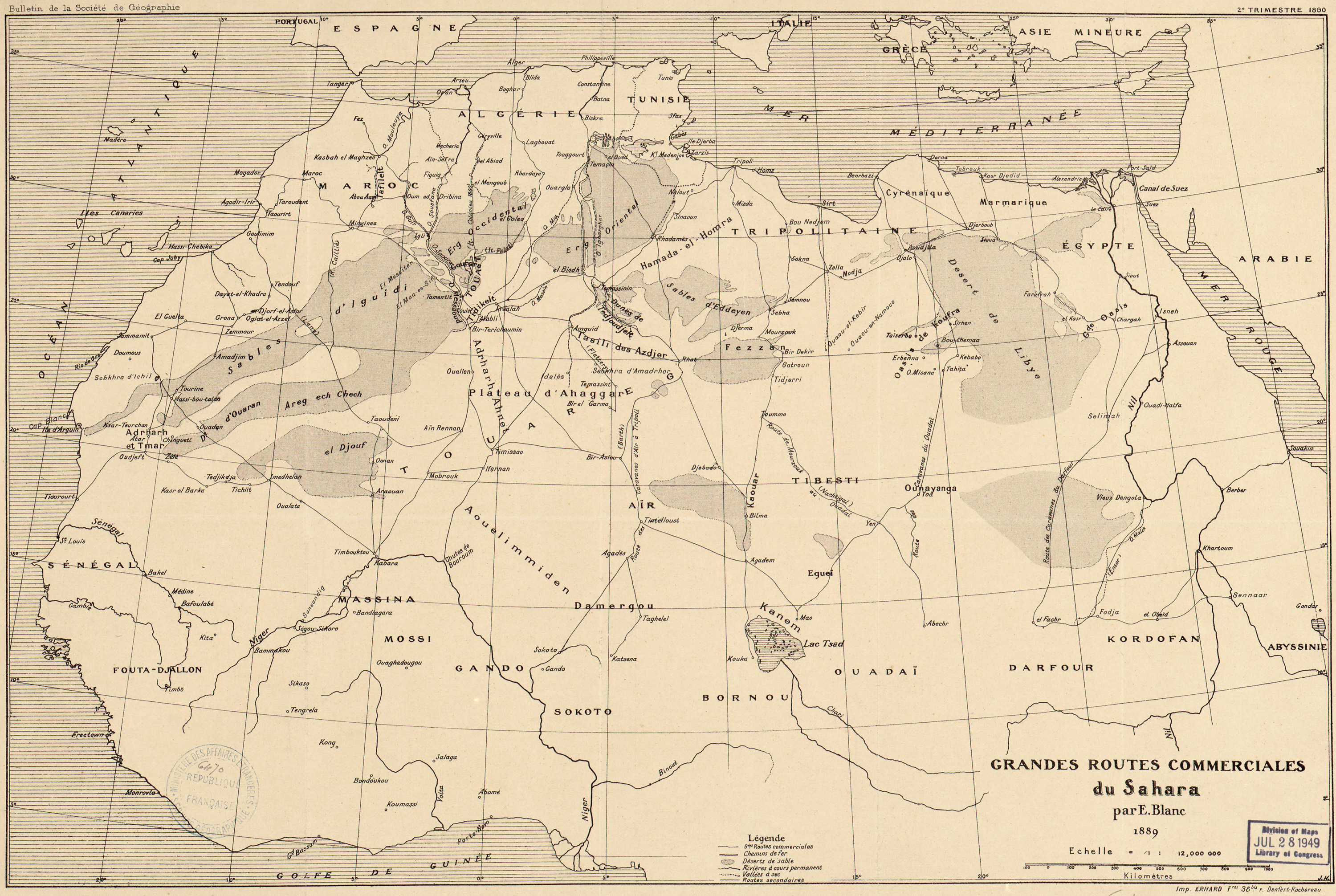 I came across this old French map of the Saharan trade routes from 1889 [full-size source]. As always, it’s interesting to see where was prominent then and what has come since. Old spellings and some names differ.