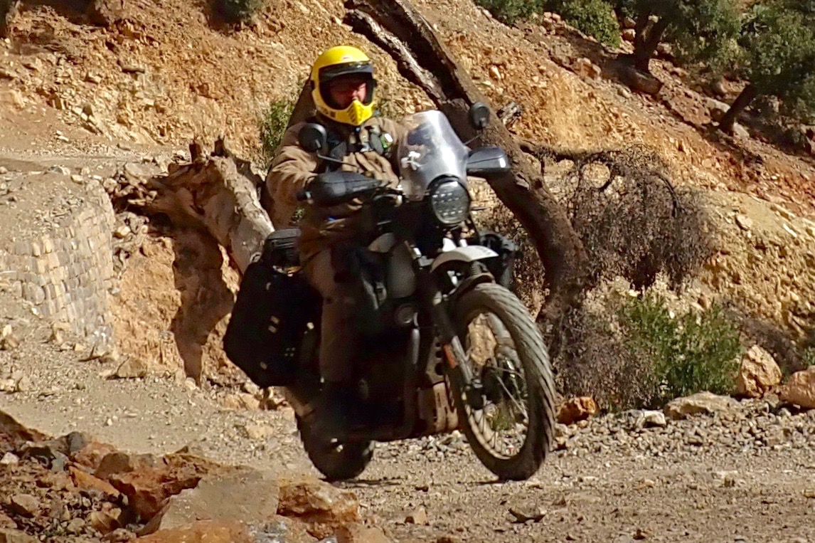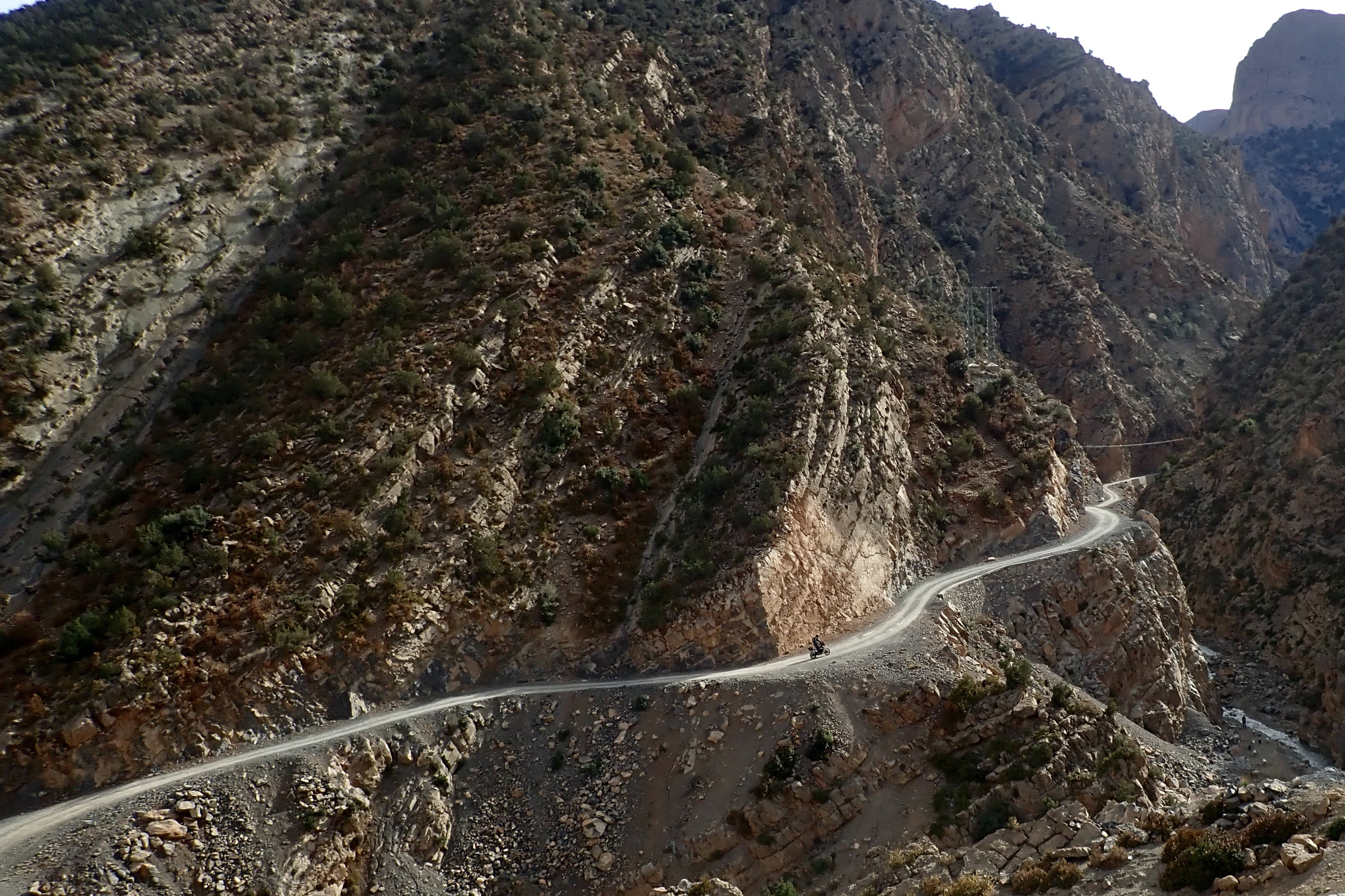 Add a few wraiths of mist plus some digitally enhanced pterodactyls, and the narrow chasm which leads into the Taghia gorge could pass for a scene from Game of Thrones. Burrowed deep in Morocco’s High Atlas, the isolated Berber hamlet beyond was only accessible by mule. So I was told in 2018 when I tried to reach Taghia on my Himalayan. Now they’ve carved a motorable track, so we rode down through the defile, crossed and recrossed a stream, and found ourselves in a small cirque or valley head surrounded by sheer, 3000-foot limestone terracotta crags. I’d not seen a place like this in Morocco. Alex Honnold came here to train in seclusion, prior to soloing Yosemite’s El Cap for the Free Solo movie. He did so by free climbing all three of Taghia’s hardest faces – 6000 feet of big wall soloing – in a single day. “It’s pretty freakin’ next level” he observes with characteristic humility in Before Free Solo, Edge of the Unknown’ (on YouTube).