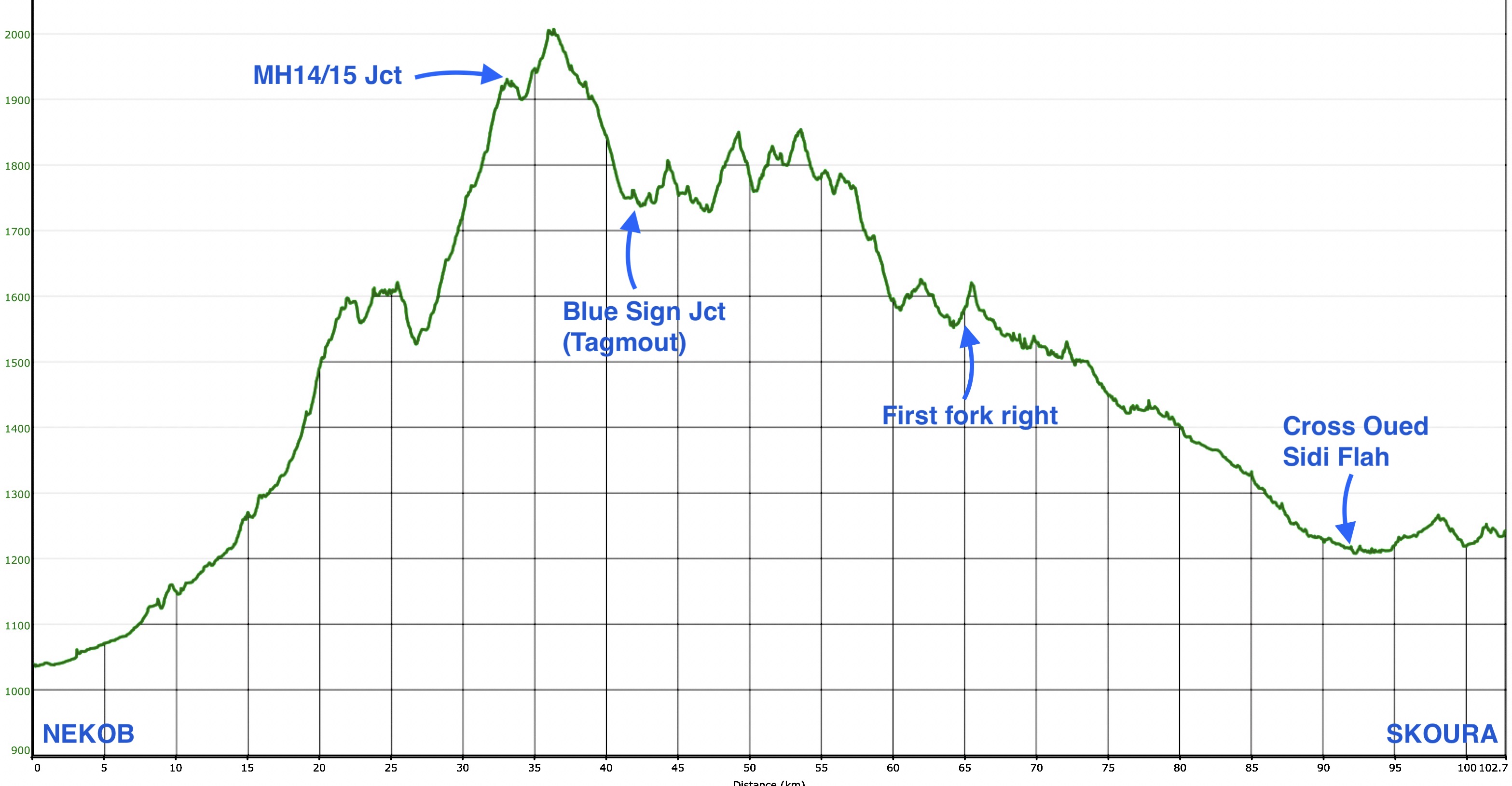 After studying Google satellite I traced a putative kml along what looked like the clearest route, and it all panned out fine with no wrong turns. Westbound, you can’t go wrong up to the blue sign in the Tagmout basin (KM42; Berber women selling trinkets) and beyond here most forks of substance are to the right on the downward section, passing north of Bou Skour village and mine site (which you don’t see) to the big village of Sidi Flah.