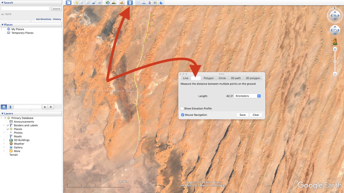 Now choose the Ruler in the top tool bar and then select Path (blanked out above when selected).
