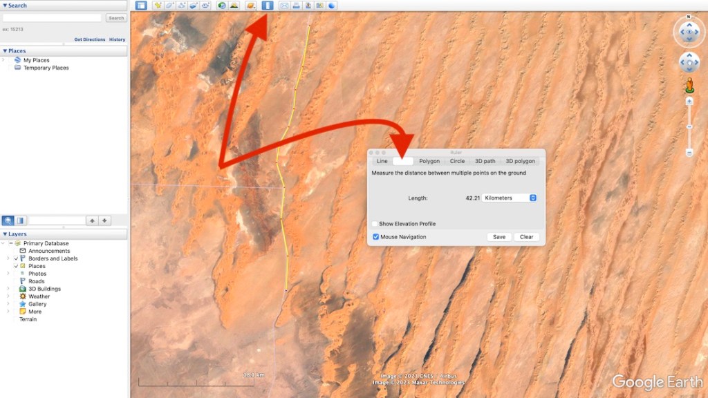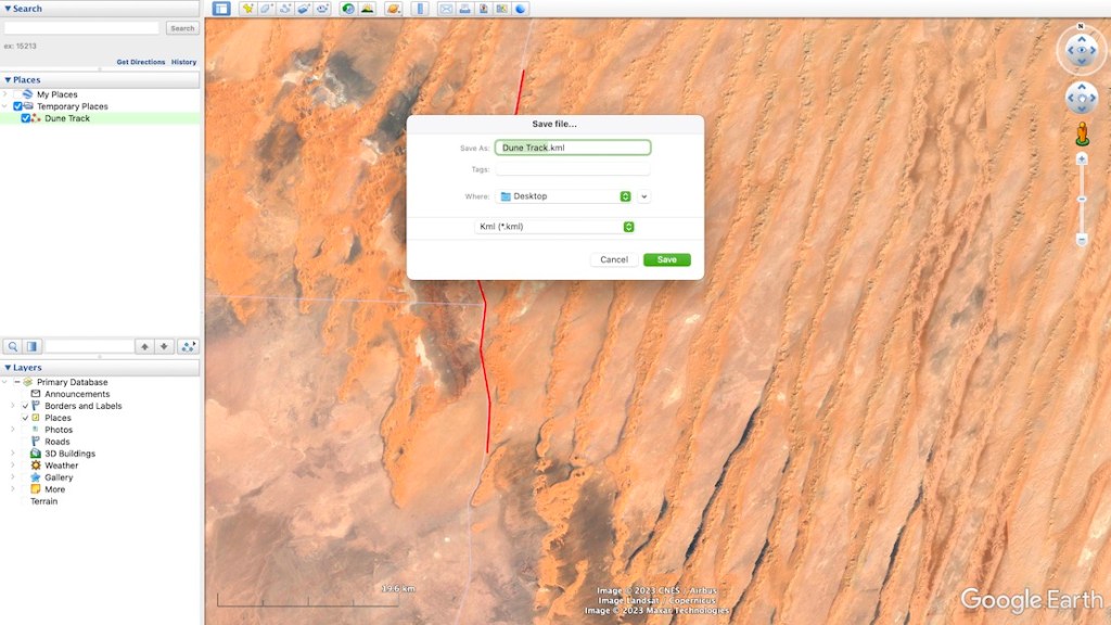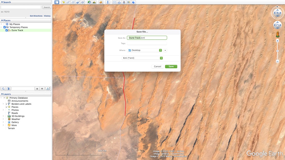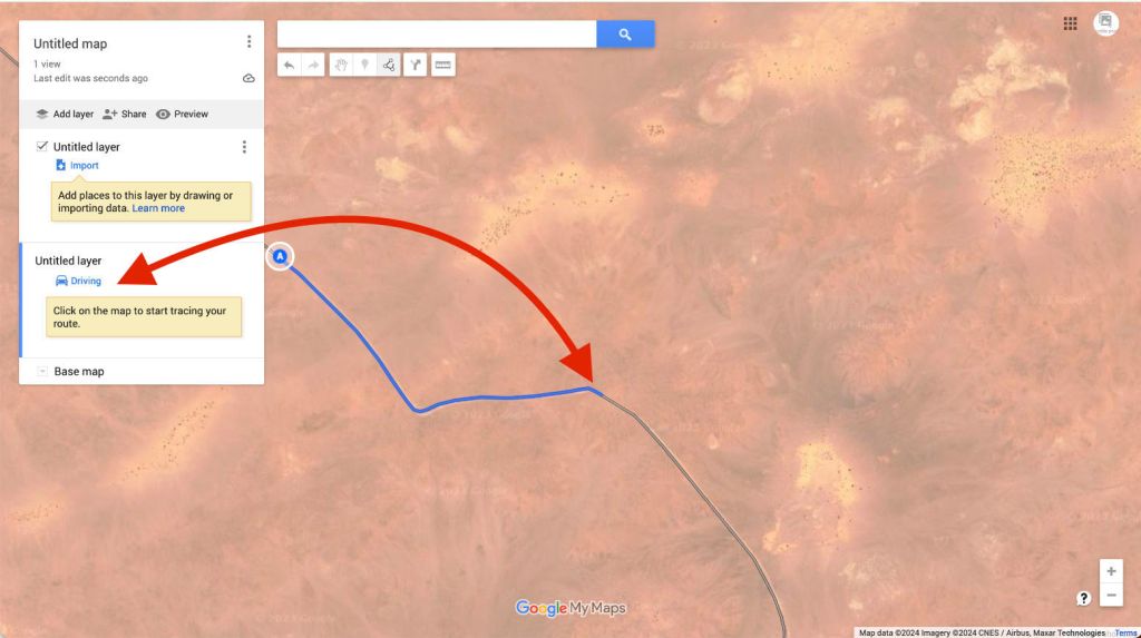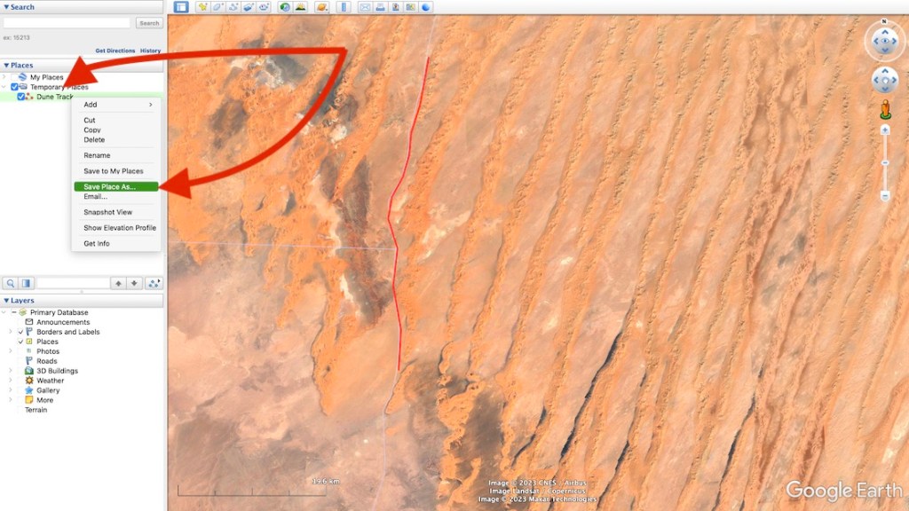 Using Google Earth Pro – no Google account needed but your annotated maps won’t be automatically saved online/in the cloud. I’ve drawn tracklogs using this method in Moroccan hotel rooms prior to setting off along remote tracks (above left), benefitting from the reassurance of knowing a track exists and where the junctions are.