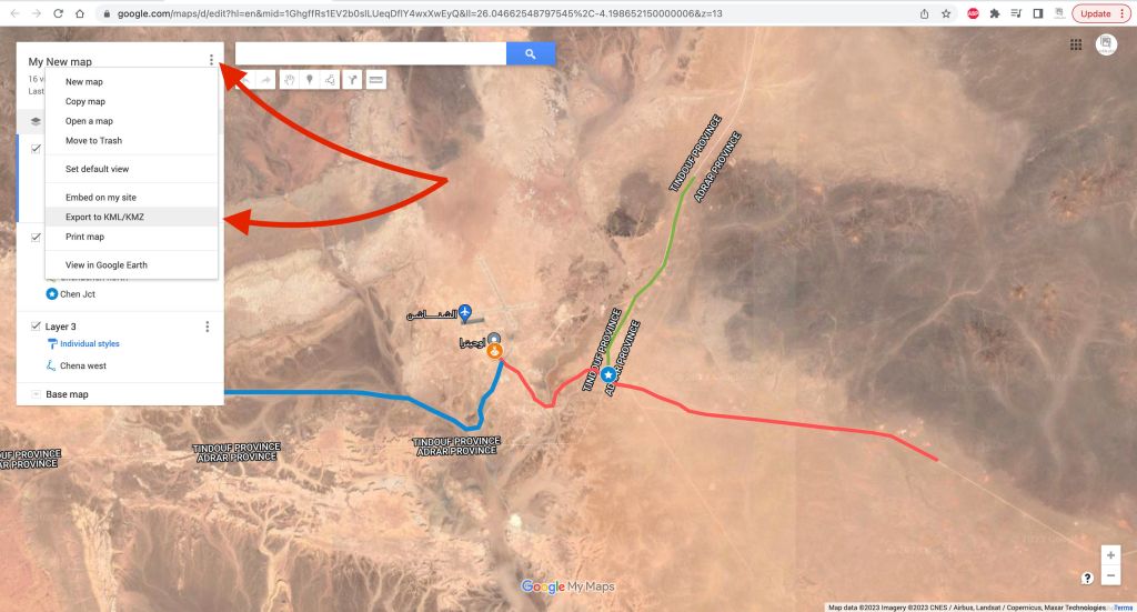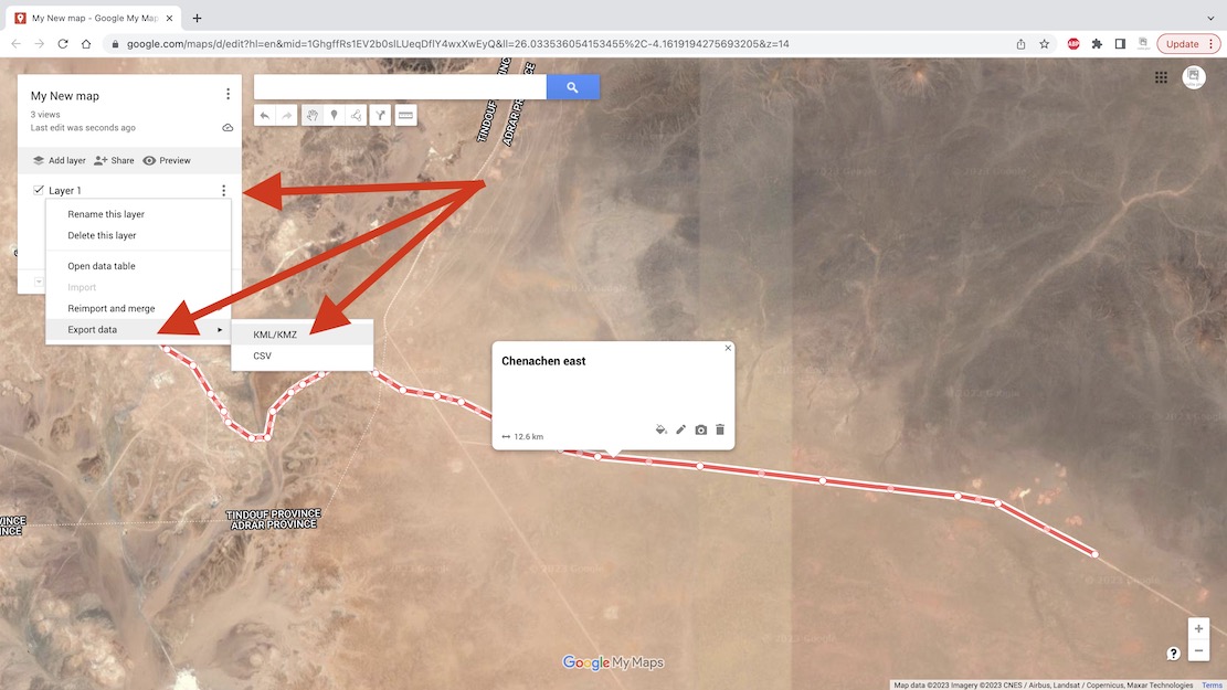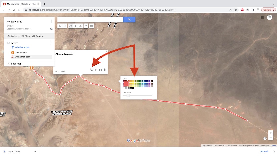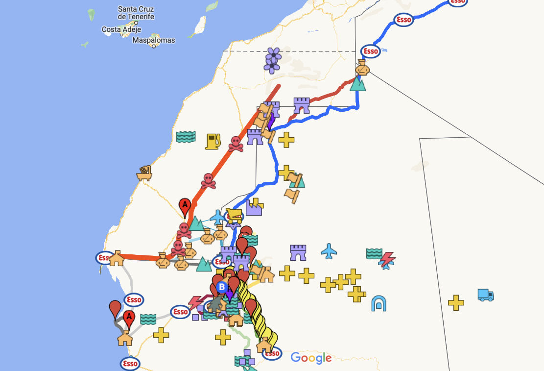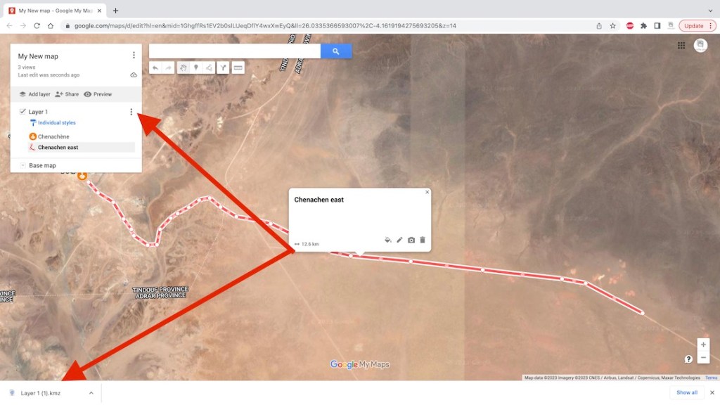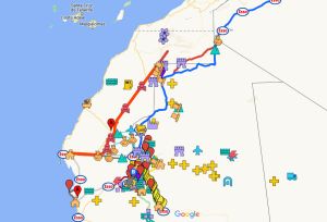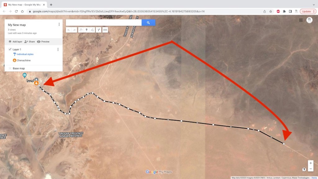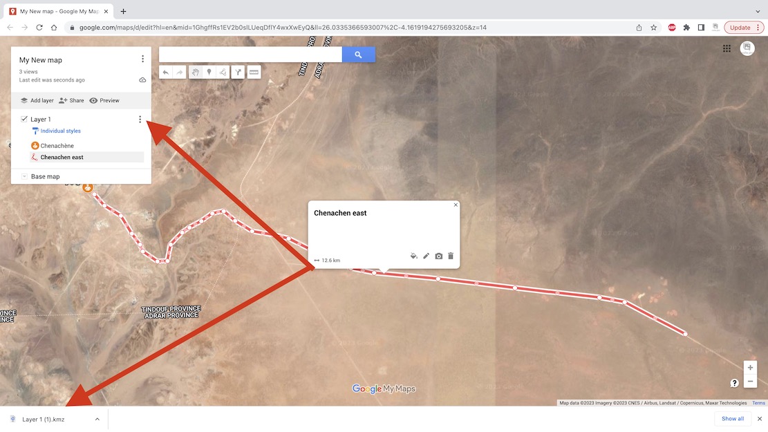 With a Google account (…@gmail, etc) you can save your routes on a Google ‘My Map‘ as has been done for the Trans Morocco Trail. It can have as much detail (tracklogs and waypoints) as you like, but Google ‘My Maps‘ are limited to about 10 layers. Layers are a bit like folders (with infinite capacity) and sometimes you have to shift tracklogs or waypoints into a pre-existing layer to free up a new one so you can import more.
