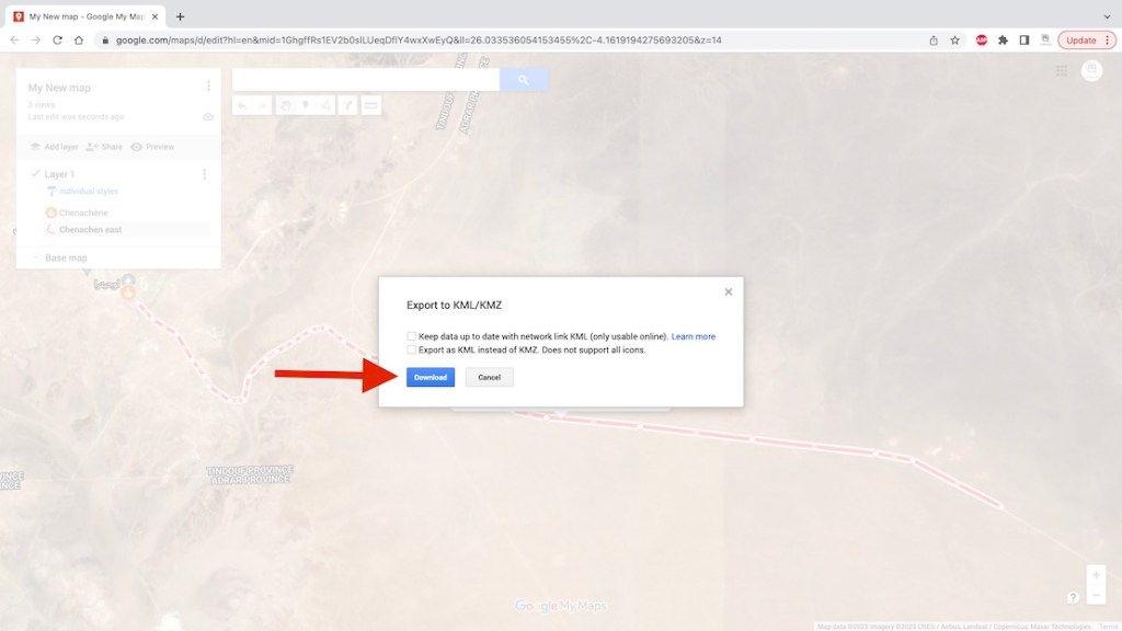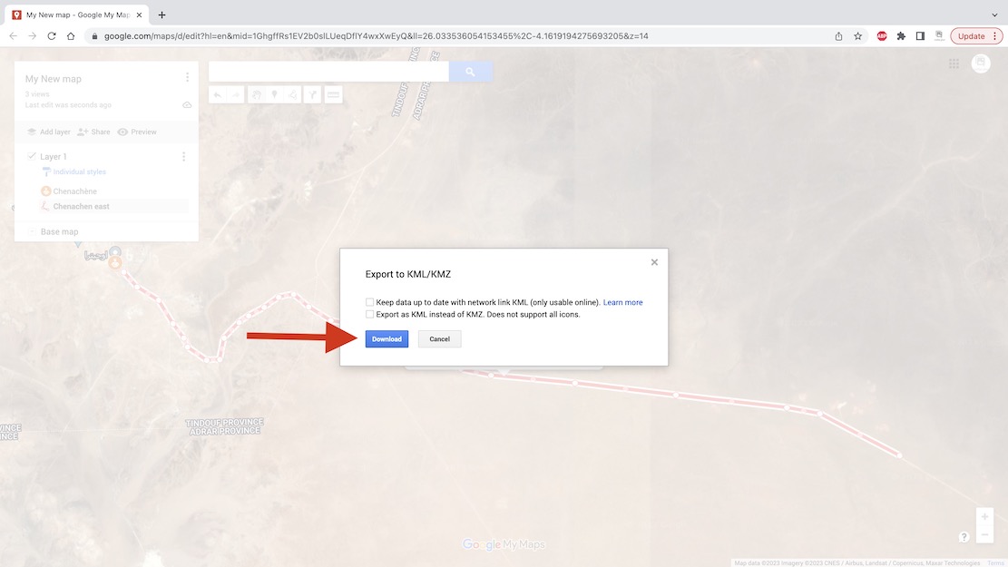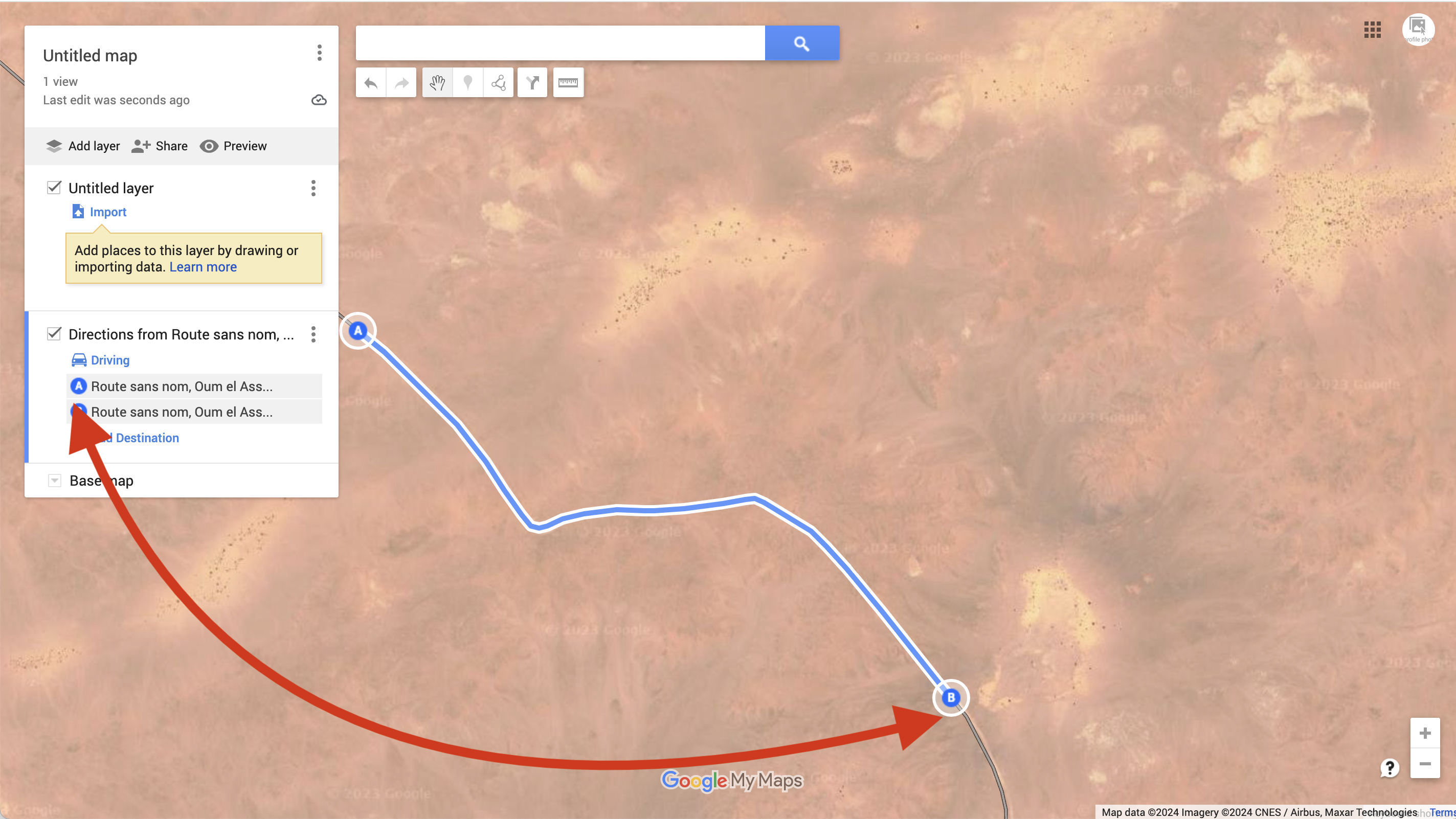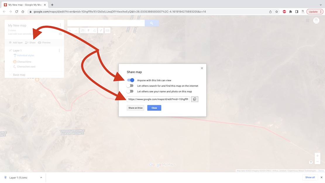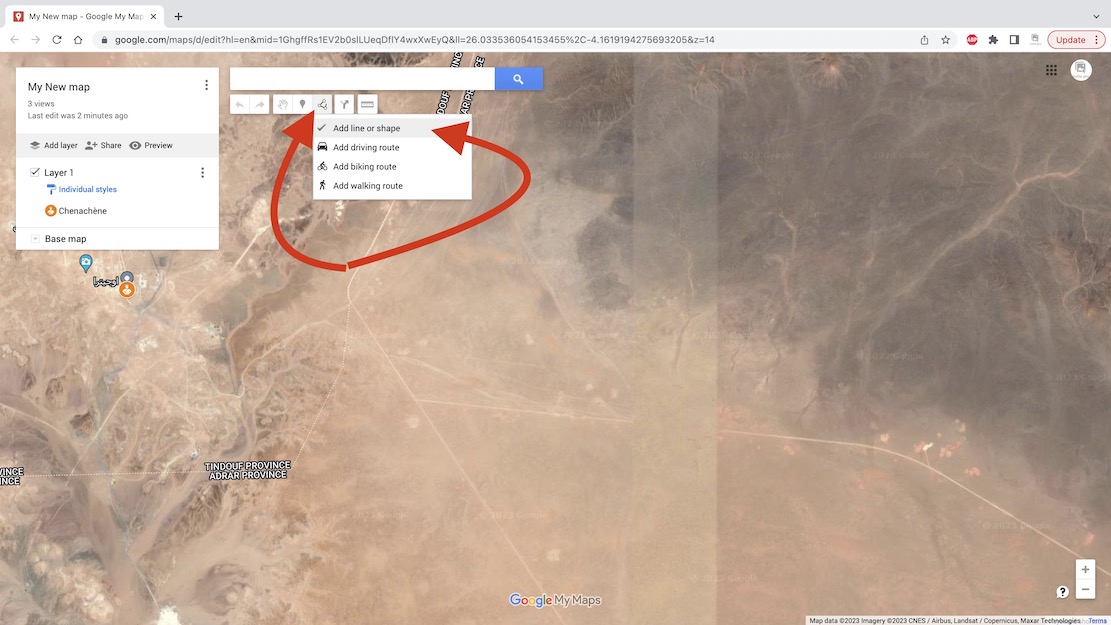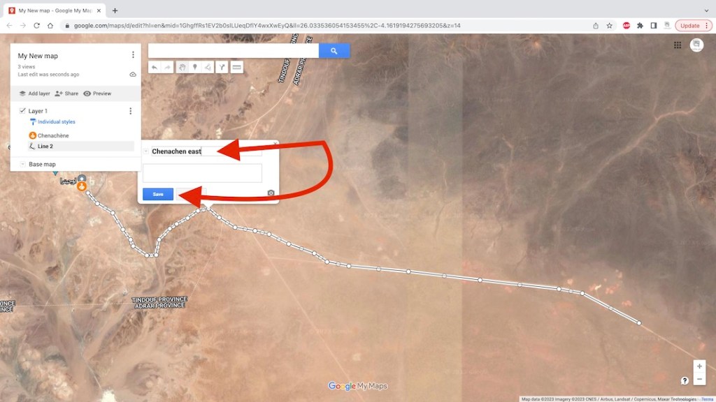With a Google account (…@gmail, etc) you can save your routes on a Google ‘My Map‘ as has been done for the Trans Morocco Trail. It can have as much detail (tracklogs and waypoints) as you like, but Google ‘My Maps‘ are limited to about 10 layers. Layers are a bit like folders (with infinite capacity) and sometimes you have to shift tracklogs or waypoints into a pre-existing layer to free up a new one so you can import more.