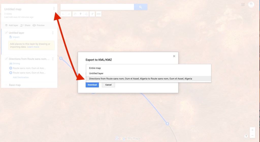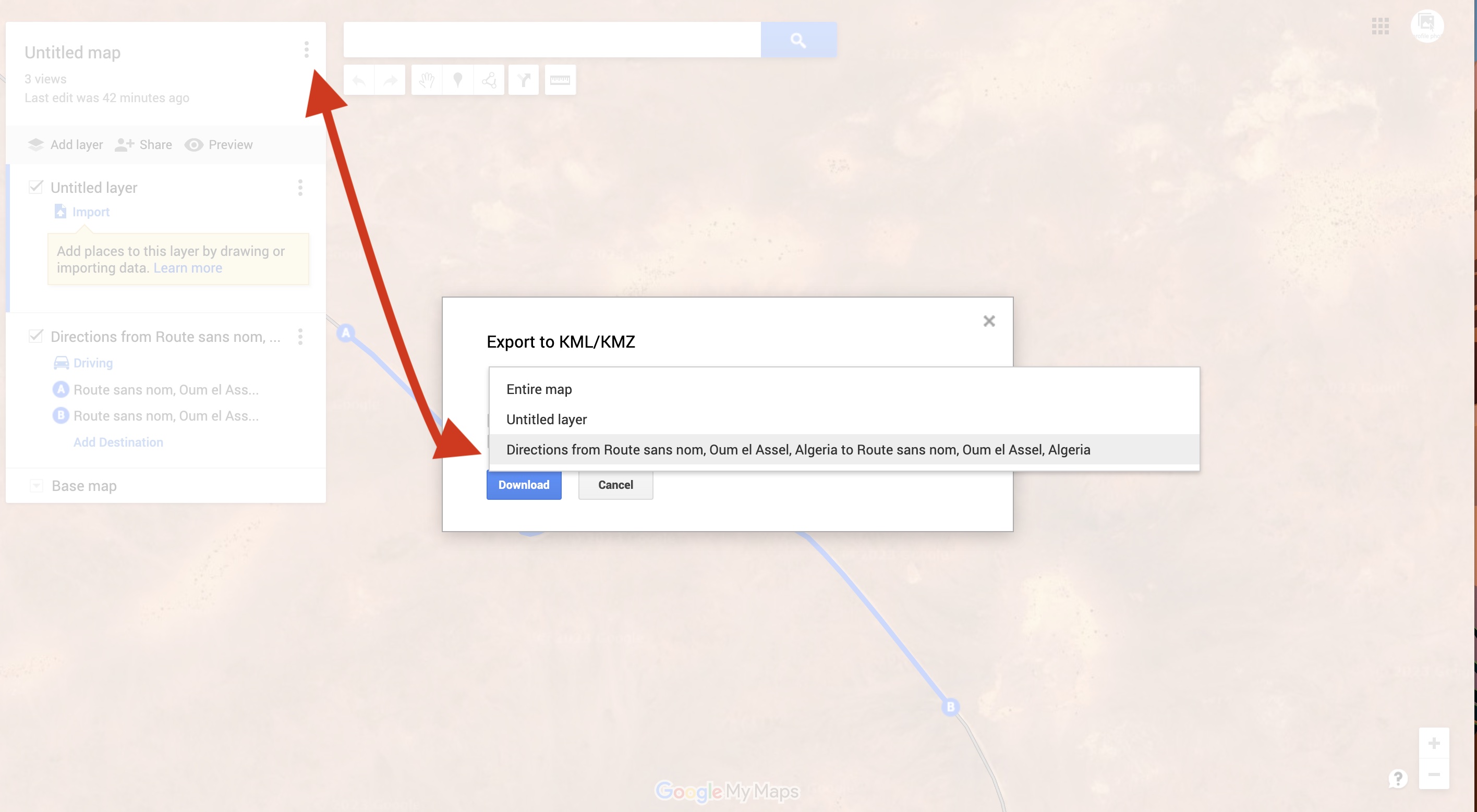 alongside the map’s name at the top. Choose the layer you want: ‘Directions from Route sans…