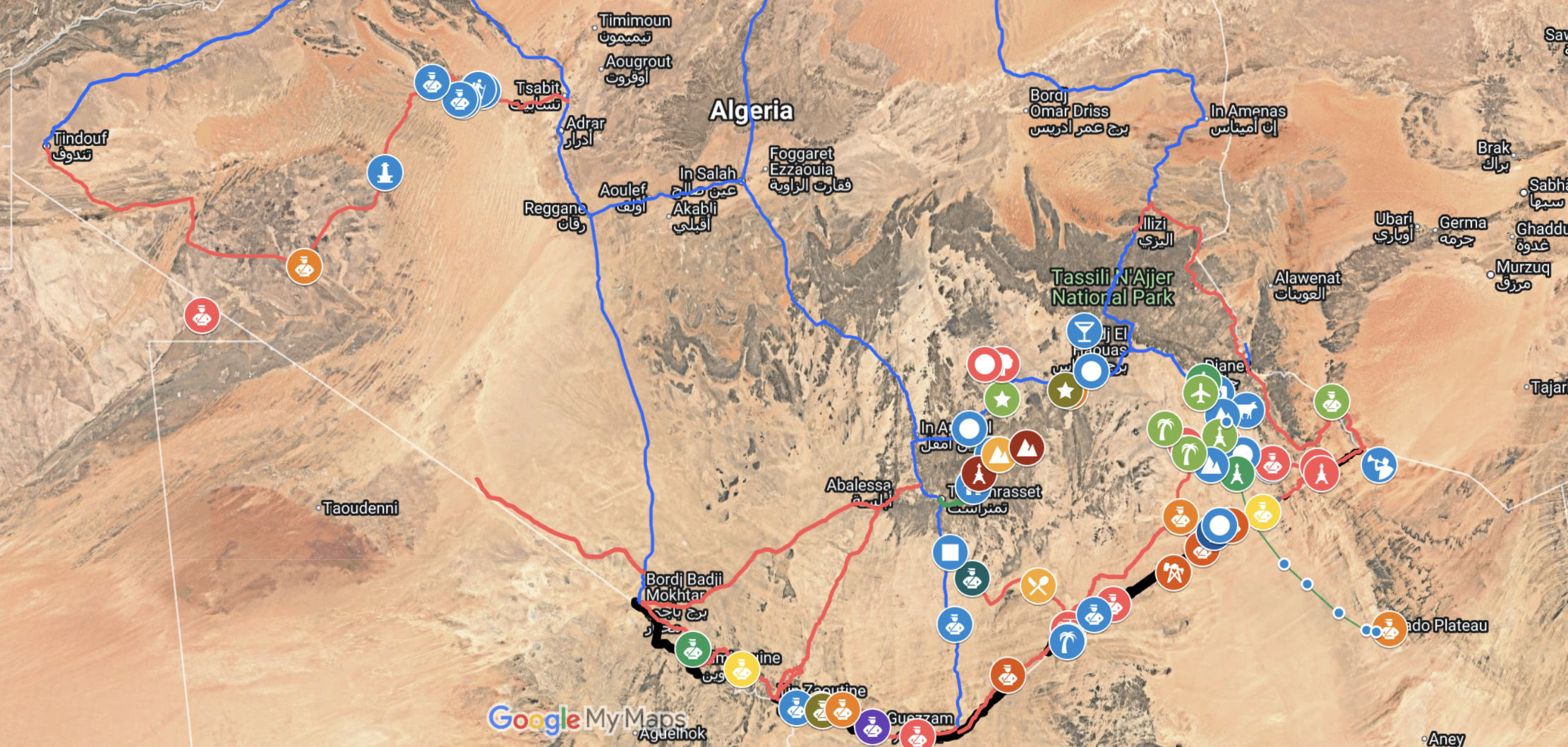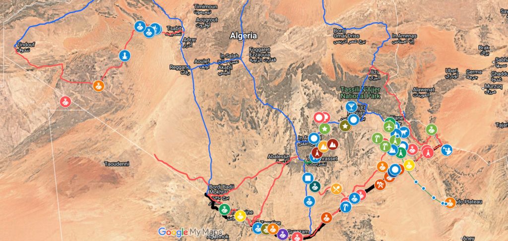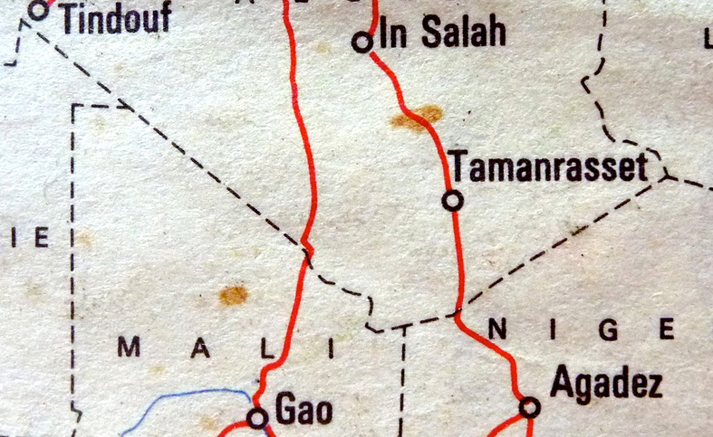 Over the span of some 2300km, two largely straight borders (below) radiate northwest to Tindouf and northeast to the Salvador-Anai border tripoint. They mark Algeria’s desert frontier with Mali and Niger. For decades as porous as a string vest, they’re crossed by the original trans Sahara routes established at the dawn of the motor car era a century ago: the Trans-Sahara Highway from Algiers via Tamanrasset to Agadez in Niger, and the more desolate Tanezrouft from Reggane via Tessalit to Gao in Mali (below).