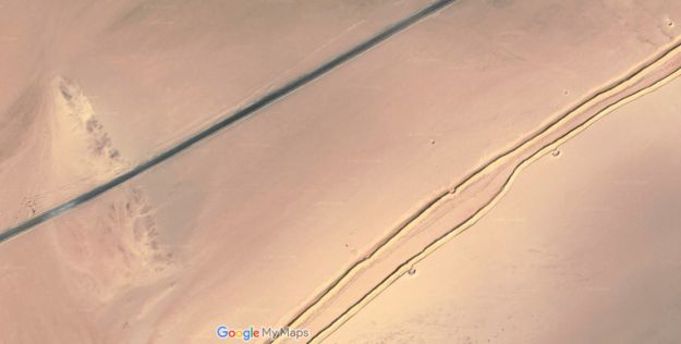 The answer seems to have been an attempt to seal it’s southern borders with a series of double berms (car-blocking sand walls) integrated between impassable natural topography, just as Morocco has done in the Western Sahara. These berms (below, black) are backed up by border access and patrol roads (red, below), and scores of bases, some with huge runways (left). They run near continuously from the In Amenas area south of Ghadames in Libya all the way round to Bordj Moktar and beyond. West of there towards Tindouf the Erg Chech acts as a natural berm.