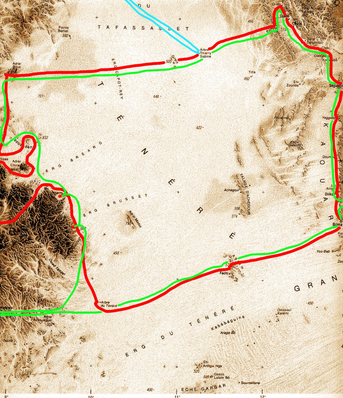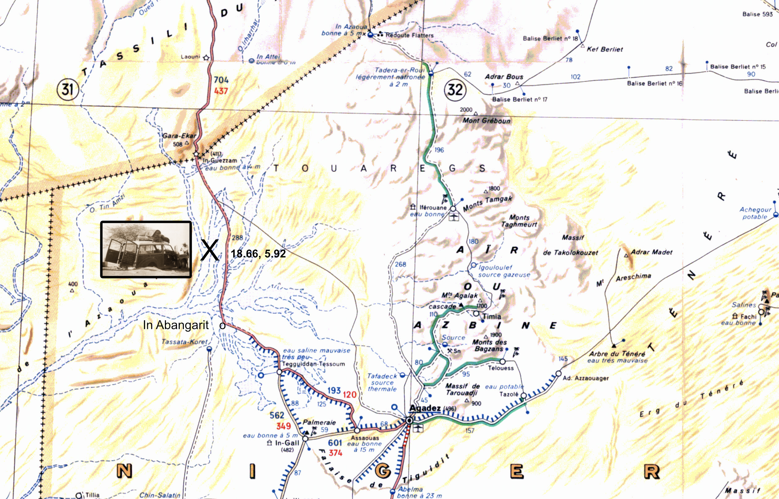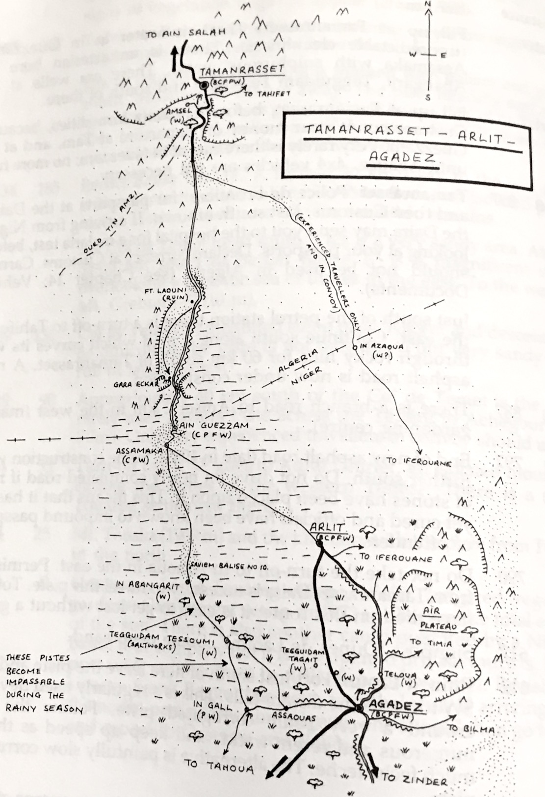 In Abangarit piste from Agadez via In Guezzam to Tamanrasset (900km). The current Arlit piste is not shown.