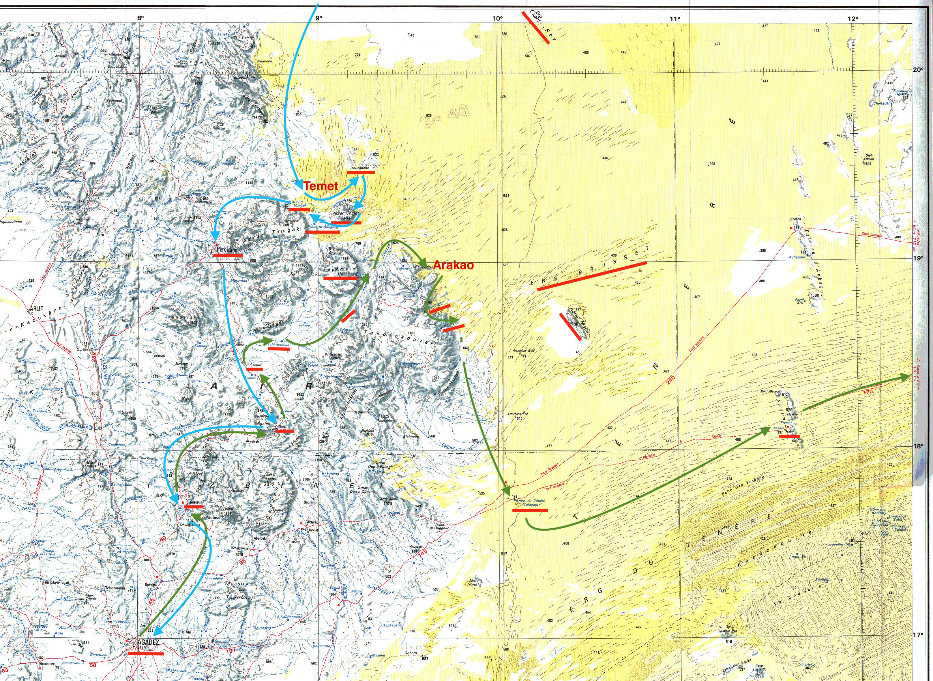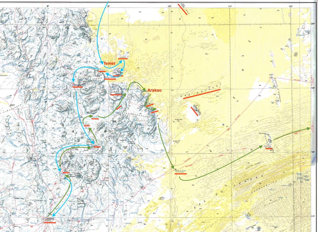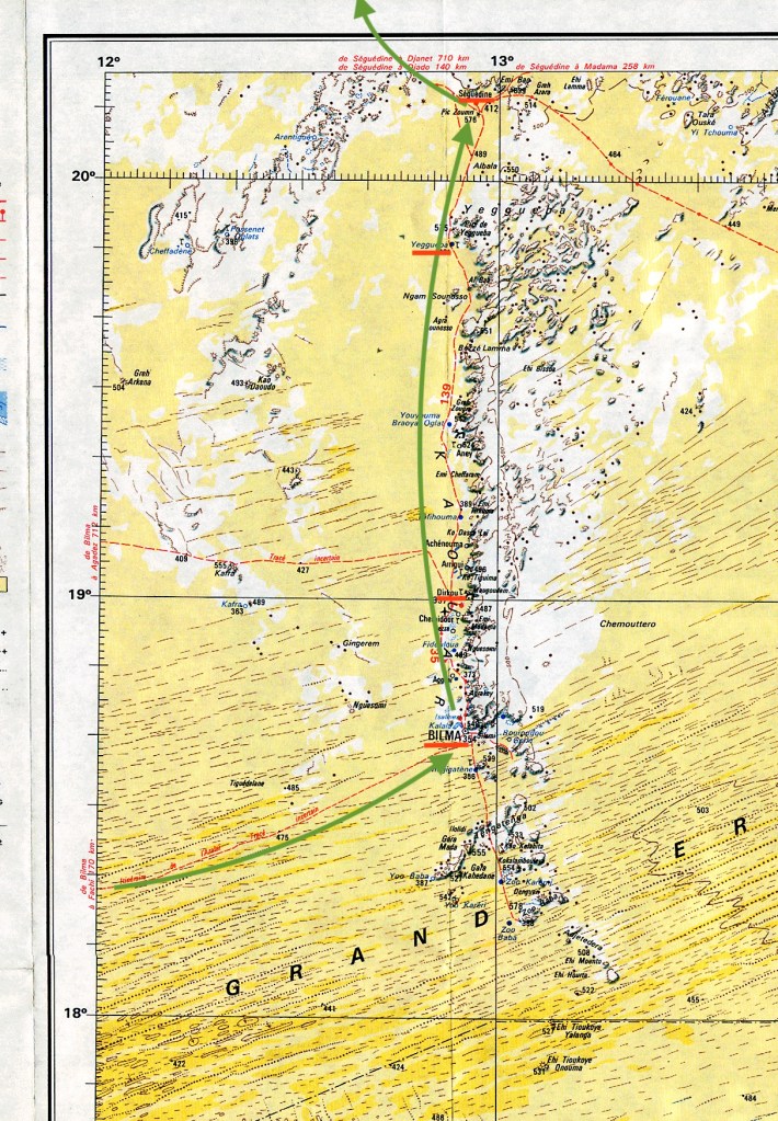 In Abangarit piste from Agadez via In Guezzam to Tamanrasset (900km). The current Arlit piste is not shown.