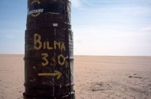 THROUGH THE ERG TO BILMA To finally see the Arbre du Tenere after reading about it over the years was quite a buzz. These days there’s a lot more there than just a bad well and the old metal tree (the original is in Niamey Museum looking as interesting as a bag of crisps). Some Japanese recently built a wacky pylon, and there’s the usual litter, other structures and a water tank. There are even a couple of new trees (“tropical species, pah!” exhorted our biologist guide, Hans) which you’re asked to water when you are there. As Tony Gastel reported in 2000, the water is far from ‘tres mauvais’ as the Michelin map states, but it is very deep, taking three men to haul up the bucket nearly 150 feet. While they watered the cars, we had a chance to wash and then headed along the dune corridors towards Fachi.