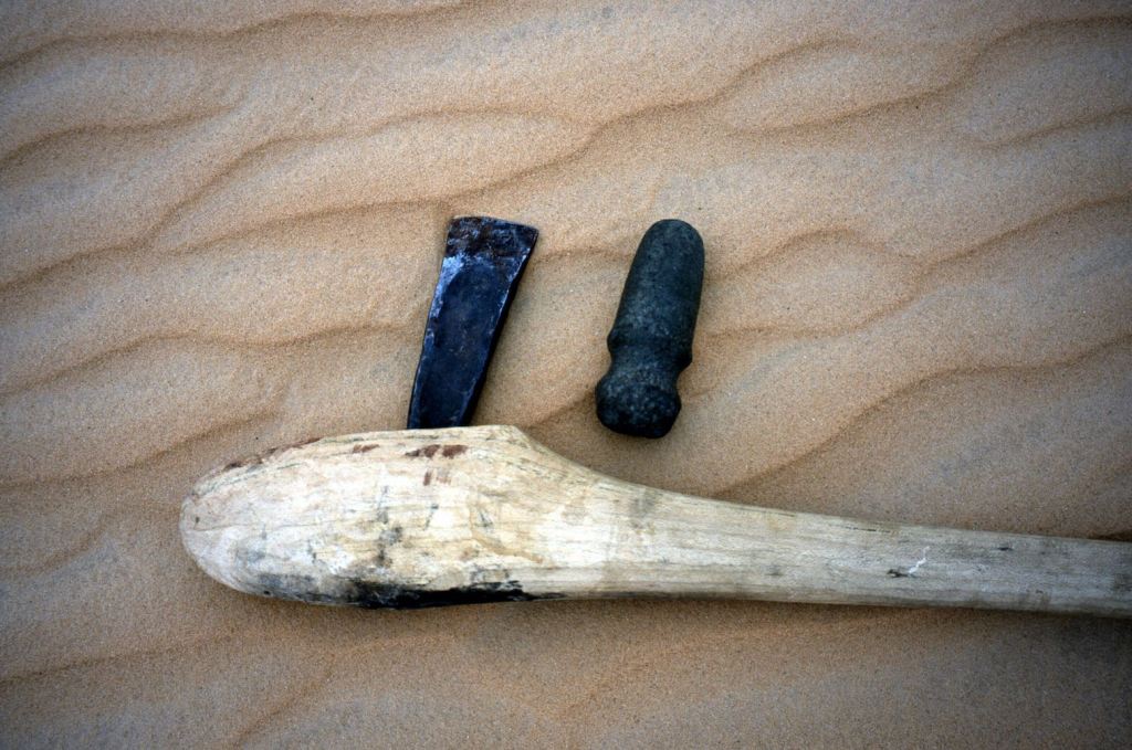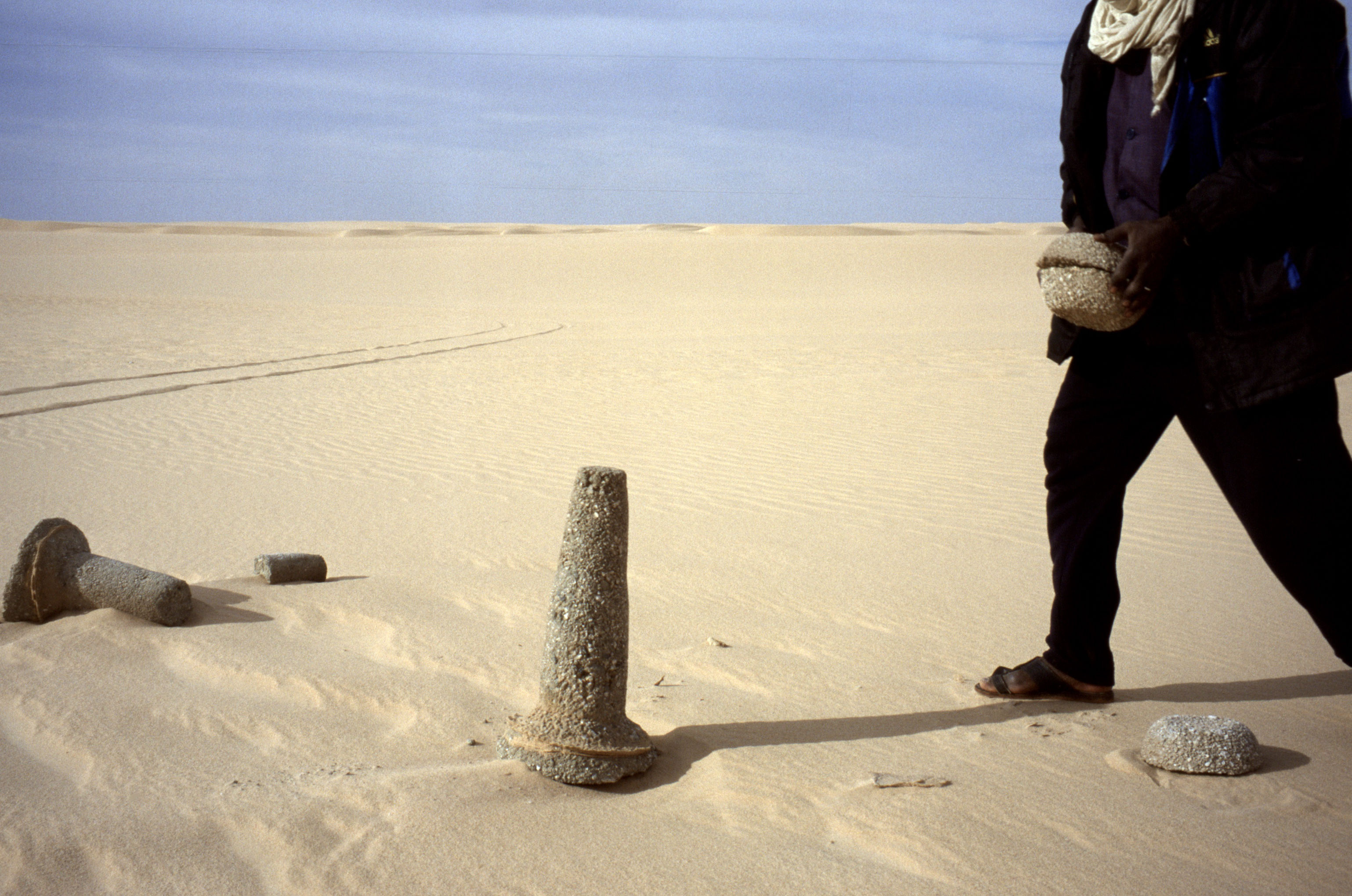 ARAKAO TO THE TENERE TREE We were now traversing the Neolithic borderlands of the western Tenere and soon pre-Islamic tombs became discernible on the hillsides. Stops hereabouts revealed the usual Neolithic artefacts and at one point I found four grinding stones (left), their easily found milling stone (or moule) plates having long ago been grabbed by collectors. Some consider the collection of Stone Age artefacts tantamount to grave robbery, but to me they’re just non-degradable Neolithic relics that tell a story. Finding them is like beach combing and a lot more satisfying than haggling over a silver Tuareg cross. And it’s more acceptable that pinching Tuareg heirlooms like swords and camel saddles from impoverished villagers. But, although the collection of artefacts was not discouraged on our tour, I’ve changed my mind on this practice now. Leave these things in the desert. In many countries it has become illegal to remove them.