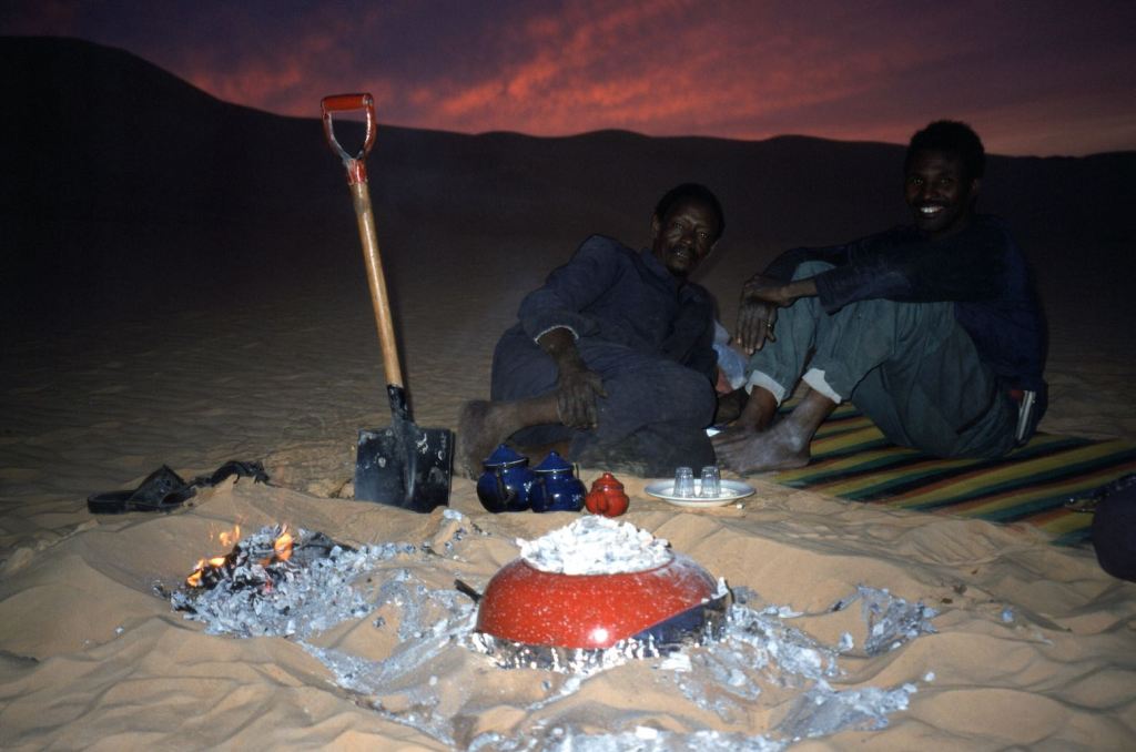 We pulled into a sheltered dip at the southern edge of the hill (below) and the cook got a fire going. Normally I’d have at least tried to climb to the top but at 500m above the desert floor, Tiska is bigger than it looks, one of the last outliers of the Tassili N’Ajjer before the ocean of sand that is the Tenere runs south to the Kaouar hills behind Bilma and the isolated Termit massif which is already in the Sahel, close to Lake Chad.