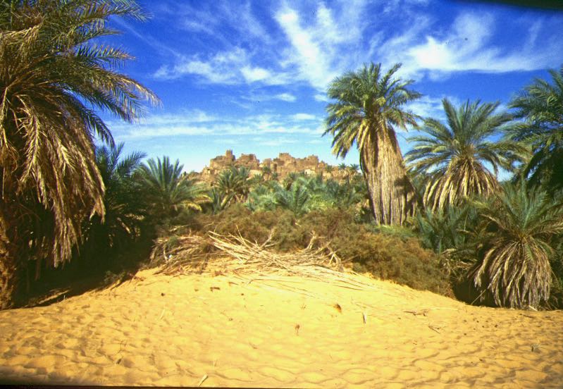 Djado (photo Klaus W.) is a huge complex which must have housed thousands a few centuries ago. In winter it’s surrounded by a lake of brackish water which I’m told oddly, disappears in the rainy season. In autumn the whole of Chirfa moves here to harvest the dates from the many palms; their zeriba huts ring the ancient ruins. Exploring the crumbling town was incredible, every corner revealed a stunning view of distant escarpment, desert sands and waving date palms. My camera had passed out in Fachi, but luckily Klaus had a bag full of lenses and film and agreed to keep shooting for me. Hans poured scorn on the theory of pseudo archeologist Uwe George in Geo magazine. He’s discovered a room with a cross relief (now called the ‘eglise’) and who went on to claim that Christians migrated here from Ethiopia in the first millennium. I’m all for interesting theories, but it does indeed sound implausible if not an outright publicity stunt which some publicity-savvy academics are fond of pulling off.