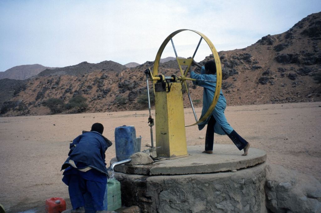 From here we drove south through the dunes to Adrar Chiriet, visible from the summits of Izouzadene, enjoying the classic east Aïr panoramas of dunes lapping against a backdrop of purple-grey plateaux. Driving into the massif, Ibrahim stopped to grab a bunch of wild grass to concoct a herbal infusion for later; a change from the endless Tuareg tea we drank daily. West of Chiriet, a rocky track led to Tchou-m Adegdeg well. Just on the other side of the Teghmert plateau was the point at the Zagado valley where we’d emerged from the Aïr nearly a fortnight ago. Here Tuareg nomads watered their herds and a camel sipped from the bowl in which my shirt stewed in detergent.