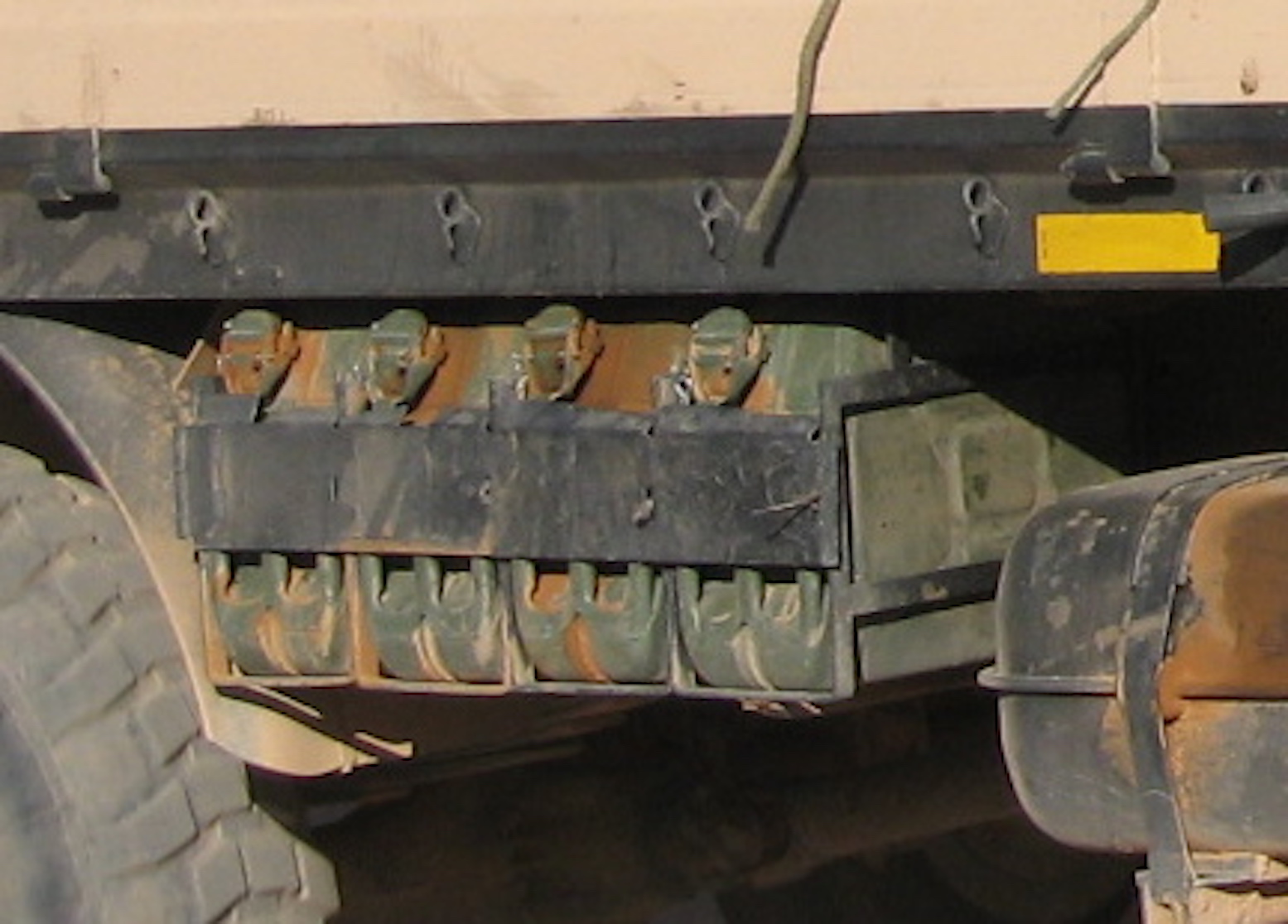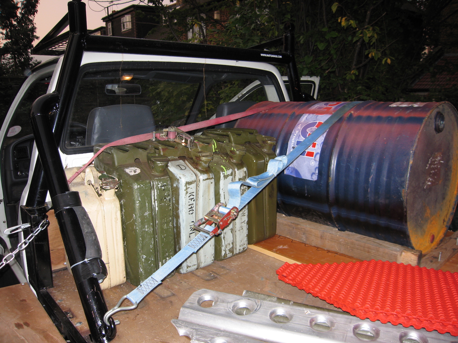 Rack of easily accessible jerries under an M.A.N.After jerricans come oil drums. Ten times bigger and as cheap or free.