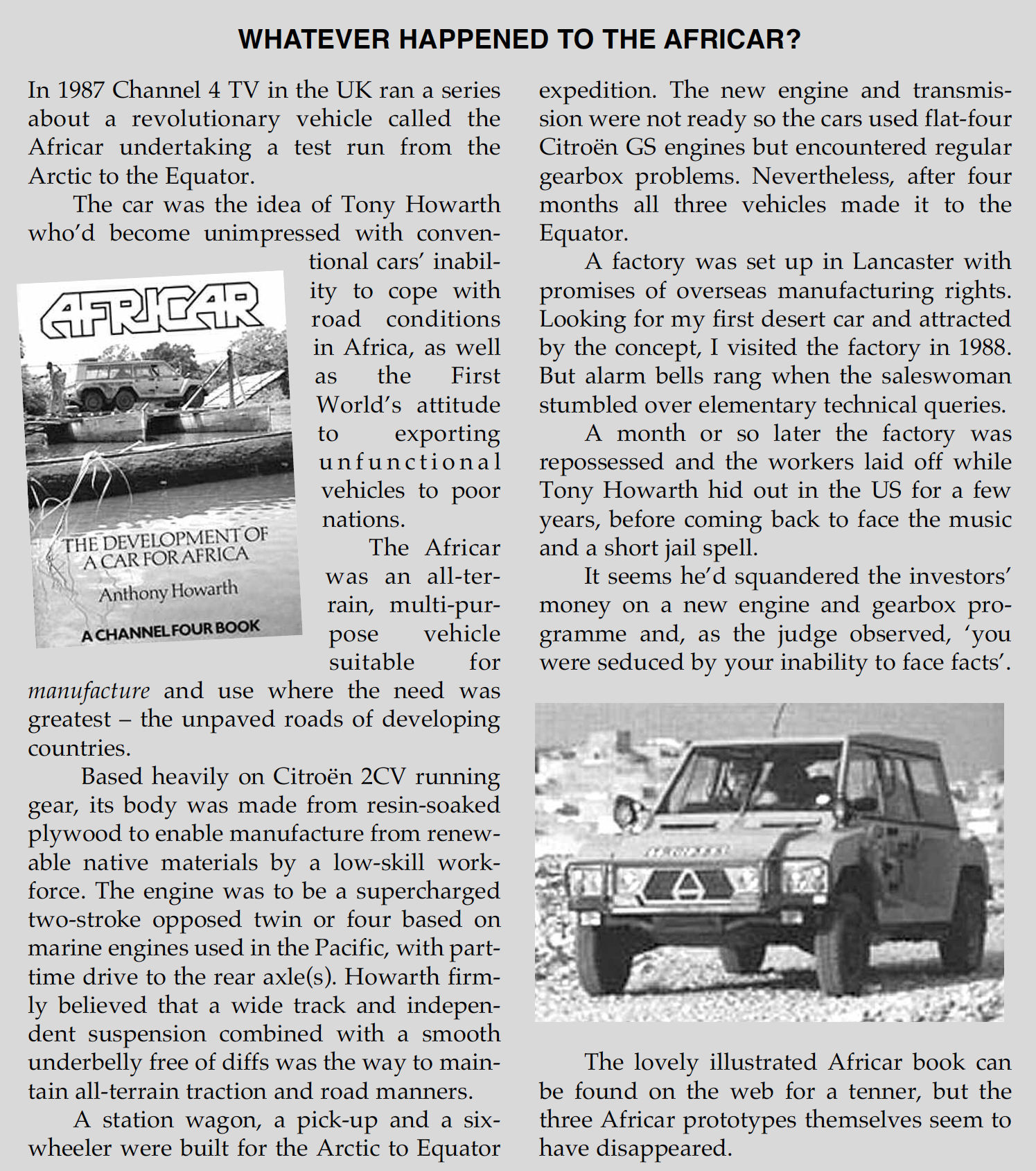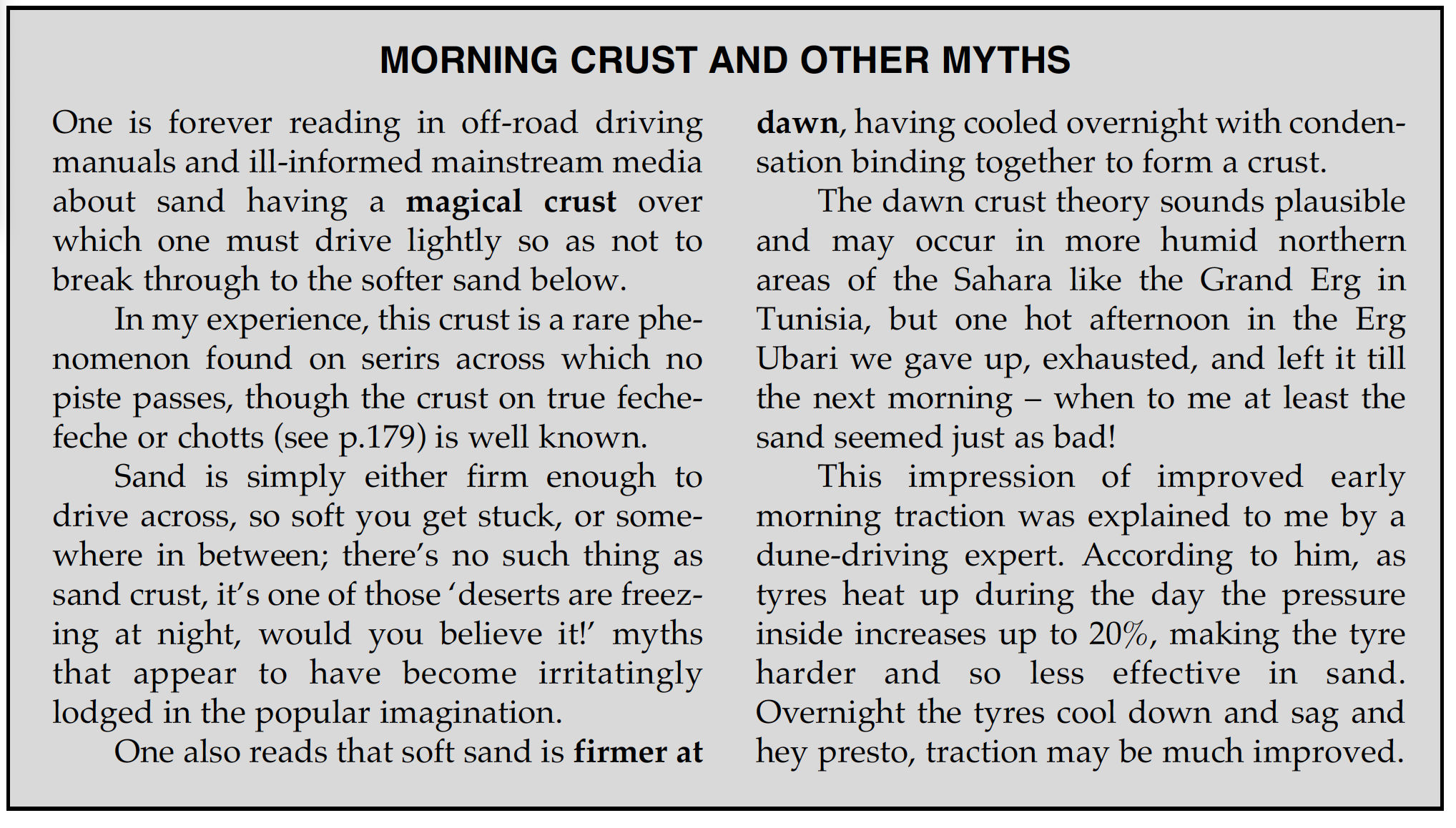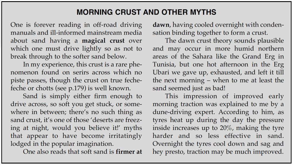 The ‘8hp’ question In Trek a highly unlikely ‘8hp’ gets attributed to Cooper’s 1950’s Traveller. It’s hard to think how, other than the author spotted it in a 1955 newspaper headline (below) and thought nothing of it. These days a suped-up moped could make 8hp, but throughout Trek ‘8hp’ gets much repeated to underline the Traveller’s crushing unsuitability for the task it had set itself. Was there ever a mass-produced, post-war car that made just 8hp? Actually there was, (thank you internet): the ultra-basic 1949, 375cc 2CV put out 9hp, was much ridiculed at the time and soon became the butt of ‘does it come with a can opener’ jokes. As Frenchman Cyril Ribas has proved over many decades, a 2CV does actually make an effective desert car. A bit more interneting soon reveals even Cooper’s 1931 side-valve Minor pushed out a healthy 19hp while weighing less than 600kg. His near-new, 800-cc, engined Traveller clocked in at 28hp. A two-litre Series 1 Landrover of the day made 55hp, so 28 was about right, and far from a puny 8hp. Oh M G, Paul Stewart does not get cars! Like most people, nor is he a desert driver. Irksomely, along with other tenuous suppositions and repeated myths (like wandering dunes making tracks unrecognisable within days) he goes on repeatedly about the perils of breaking through the thin ‘sand crust’ which formed each night under the star-lit desert. Don’t start me on sand crust (see below).