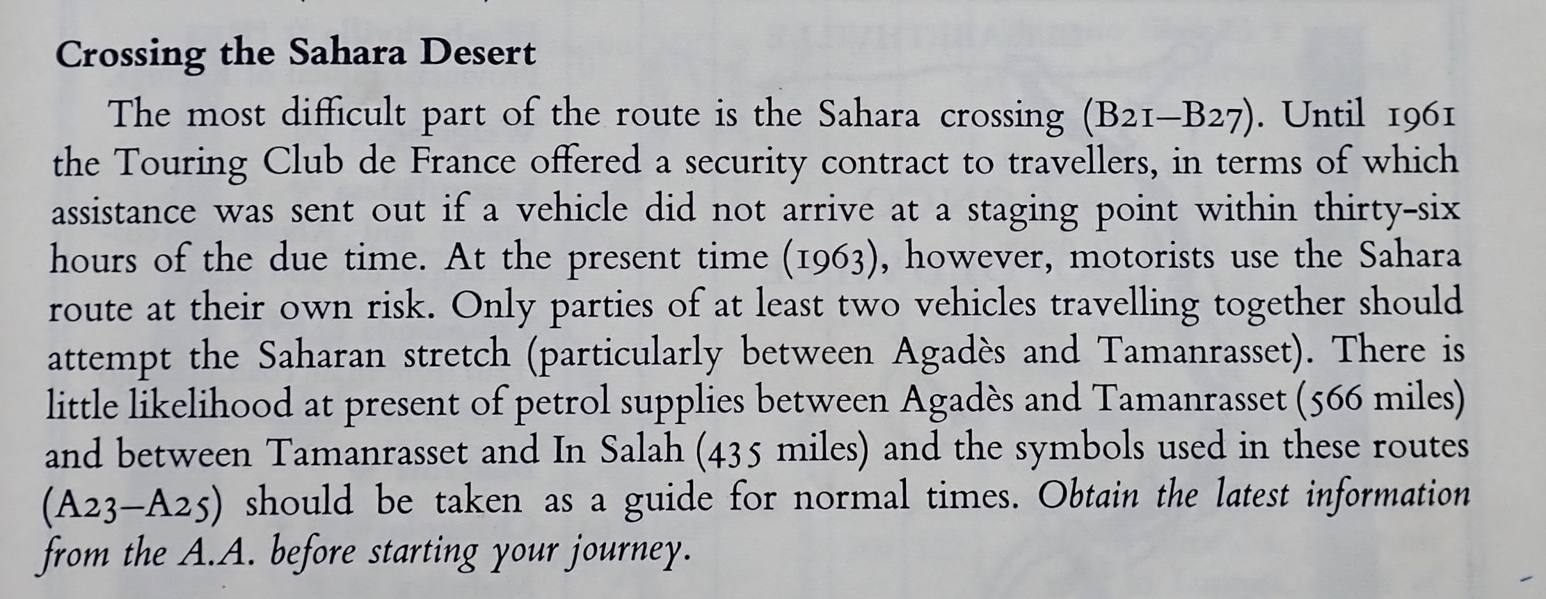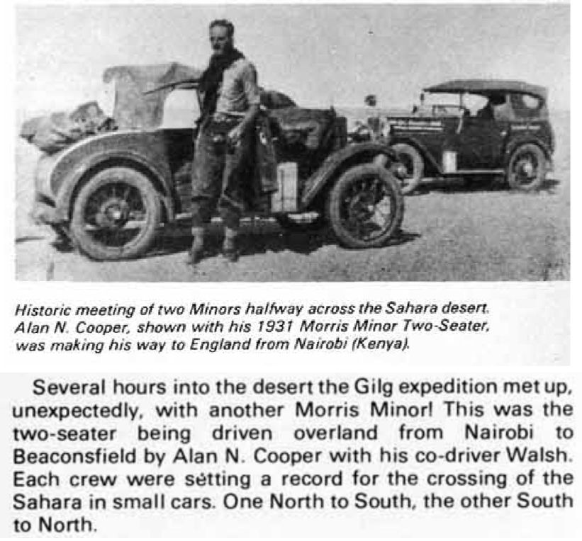 To his credit, over 20 years earlier Alan Cooper had completed a similar African crossing in a two-seater Morris Minor, even getting this achievement featured in The Times as the smallest car to cross the Sahara to date. The original Minor was more Model T Ford than the rounded post-war ‘Moggie’ we know and love. By 1961 that famous model became the first British car to sell a million, and was my parent’s first car (left). On that first crossing the young Cooper had just one passenger via the Tanezrouft crossing from Gao to Colomb Bechar in March, the time of year when temperatures in the Sahara begin to escalate quickly. Near Reggane he ran into two other Brits and a desert guide in a bigger Morris car heading south for the Cape (pix below; 1978 documentary on YT). Both Morris crossings occurred barely a decade after Citroen half-tracks had been the very first ‘cars’ to cross the Sahara north to south, pioneering the long, bleak, waterless but flat Tanezrouft route to Mali and the Niger river. On the way they established the famous ‘Bidon’ staging posts which were to feature on future maps. In the 1930s I don’t think the Hoggar route between Agadez and Tamanrasset was yet regarded as motorable.