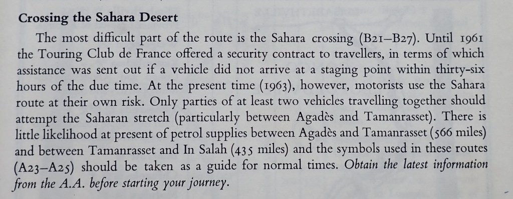 The 1990 edition of the Sahara Handbook (left) claimed ‘4×4 vehicles are not necessary’ on the In Abangarit piste (right). The Swiss Beetle (see below) proved that and the book’s original authors undertook most of their travels in a Kombi van. But the Handbook went on to advise, from Assamaka ‘… head south on a bearing of 170°. Keep speed up… Several big sandy patches and seas of bull dust, especially [110km] south of In Guezzam‘. There was no Assamaka back in the 1950s, but by the 1980s the Handbook warned ‘Niger frontier officials [at Assamaka] have been known to force … travellers to go via Arlit… [to Agadez]. Subsequent landmarks given on the now little-used In Abangarit route description are spaced up to 100 or 150km apart, with balises as every 5km, too far to see one from the next. In 1986 on the the shorter Arlit piste I myself soon lost track of the balises, but that’s another story (below).