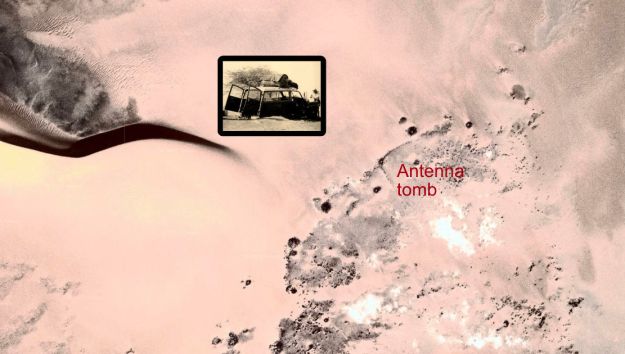 Cooper and Freya were buried by the Legionnaires at a waypoint given in the book as 5.55’N x 18.40’W. Even once corrected to N5° 55′ W18° 40′, this is way out in the Atlantic, some 600km off the coast of Guinea. I suppose in 1991 verifying a waypoint was less easy than now, but wasn’t anyone in production even curious? Jumble it about some more and you get N18° 40′ E5° 55′ which looks about right: a point among low dunes 10km west of the current piste and halfway between In Abangarit and In Guezzam (see map above). The book makes a lot of the doomed expedition’s ill omens; perhaps the final one is that the car came to rest just half a mile from from a cluster of pre-Islamic tombs, including a classic, east-facing antenna (above).