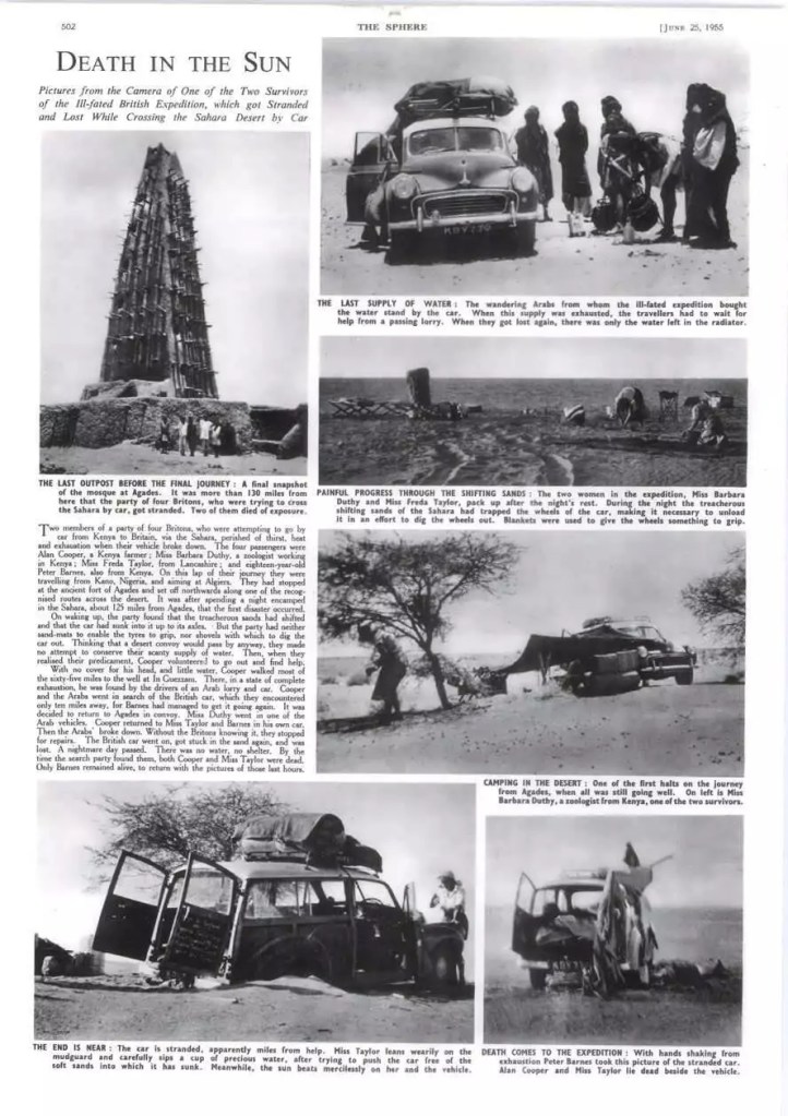 In the enervating, pre-monsoonal heat, the foursome did manage to stagger across the desert to within 50km of In Guezzam. But getting that far had entailed a lot of digging and pushing, decimating their inadequate water reserves. It was at this point the Traveller caught up with a lorry rescuing the nearly dead Cooper, who 50km earlier had set off north on foot from the then bogged car to get help. The other three got the car moving again and caught up. Cooper was found delirious by the southbound Algerian driver in a resupply truck (a Citroen Type 32 perhaps) carrying masses of water and recovery gear, and accompanied by a Swiss couple in a VW Beetle. Much against Cooper’s demands, the group insisted on carrying on south to Agadez to get Cooper urgent medical attention. Once in Agadez, the lack of permission would have come to light and they’d all miss the desert crossing window for sure. A compromise was agreed: they’d backtrack together about 150km to the well at In Abangarit where the Traveller would wait to join the returning Citroen heading back to Tam. To reduce weight in the Morris, Barbara chose to ride in the truck – a decision which probably saved her life. Peter ends up driving the Morris at the front of the convoy, while Freda tended to the semi-conscious Cooper in the back. But on losing sight of the following vehicles, at the still domineering Cooper’s insistence, fatally, they kept going. This rashness is hard to explain other than a bloody-minded craving to control events, no matter the risks. The Morris strayed off track, as is so easily done, got badly bogged again and, with all the water in the truck, first the severely dehydrated Cooper and the frail Freda died by the car. These deaths were almost certainly hastened by the colonial-era outfits shown in photographs: baggy shorts, short sleeves and frequently no headwear which all accelerate the body’s water transpiration in an effort to keep cool. It’s why Tuaregs are covered head to toe. With just hours to live, Peter was found a day or two later by a search party of Legionnaires sent from Agadez.