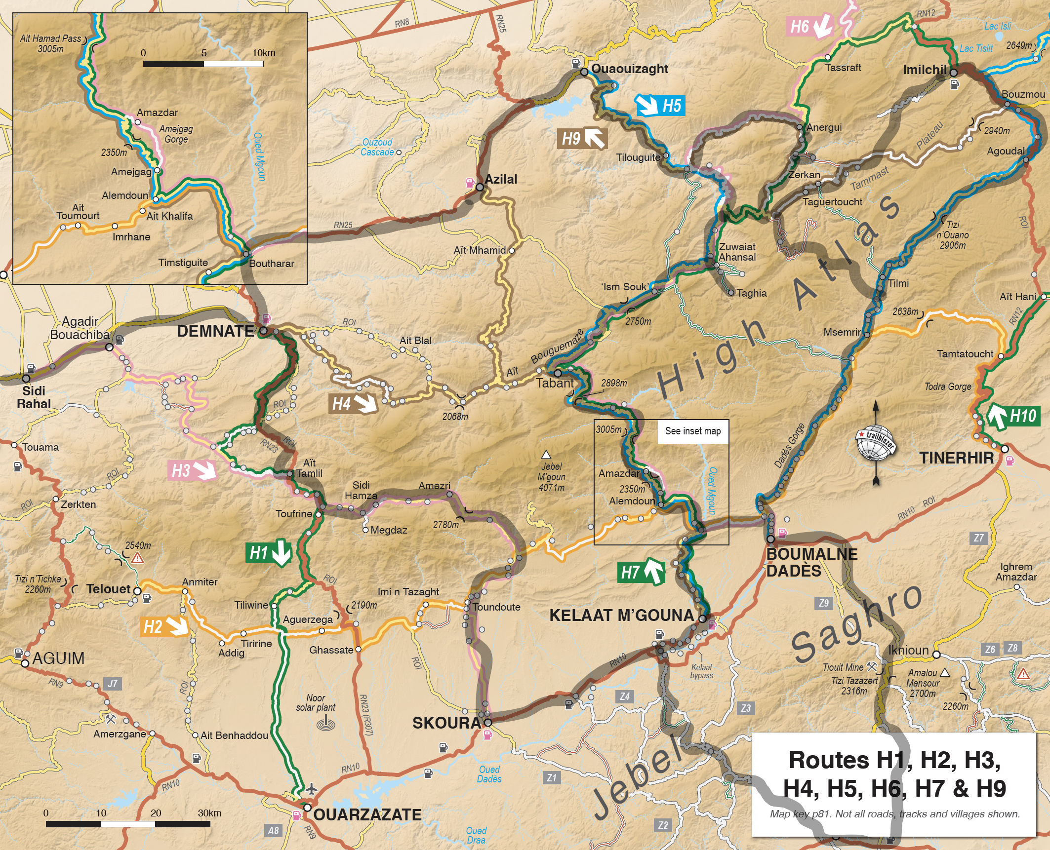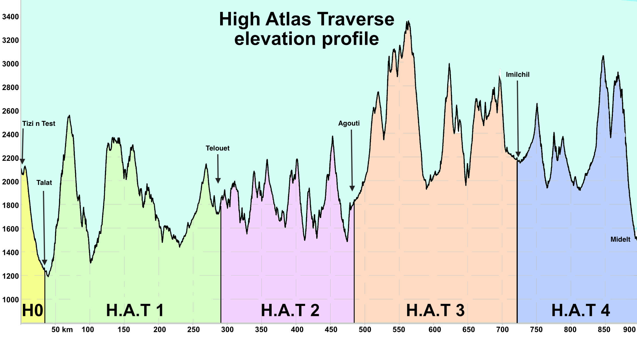The 900km High Atlas Traverse is now online with the maop getting 1000 views a day. Download the gpx files at the link above. The H.A.T is like the TMT: quiet backroads and mostly easy trails – but it follows the mountain watershed via the highest motorable passes. Only about 15% overlaps the TMT and it reaches up to 3340 metres (nearly 11,000′) and permanently stays above 1500m from Stage 1 onwards. Bigger bikes and longer vehicles may struggle on some of the climbs. More on the link above and some pics from our recce below.