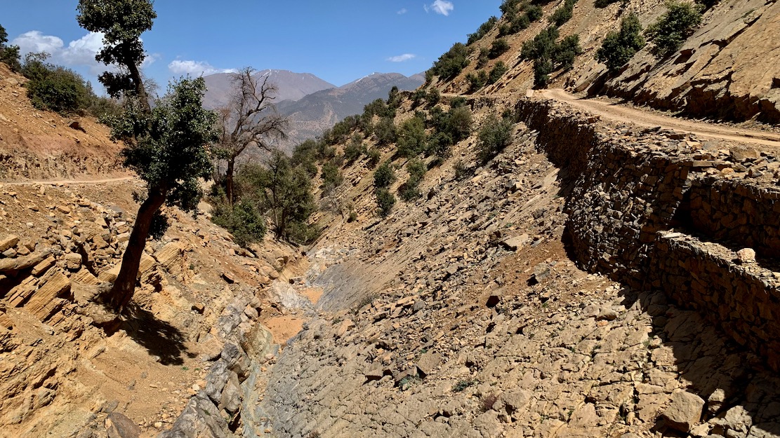 The following morning the three of us set off for a day trip to the Taghia cirque behind Zawaiat Ahansal, taking the newly repaired climb south out of Anegui which in early 2024 James and I had probably been the first to descend (left), just before it was completed. The bridge at the south end of Anergui was already semi-collapsed following the September 2024 rains, but the track up to the plateau was now in great shape.