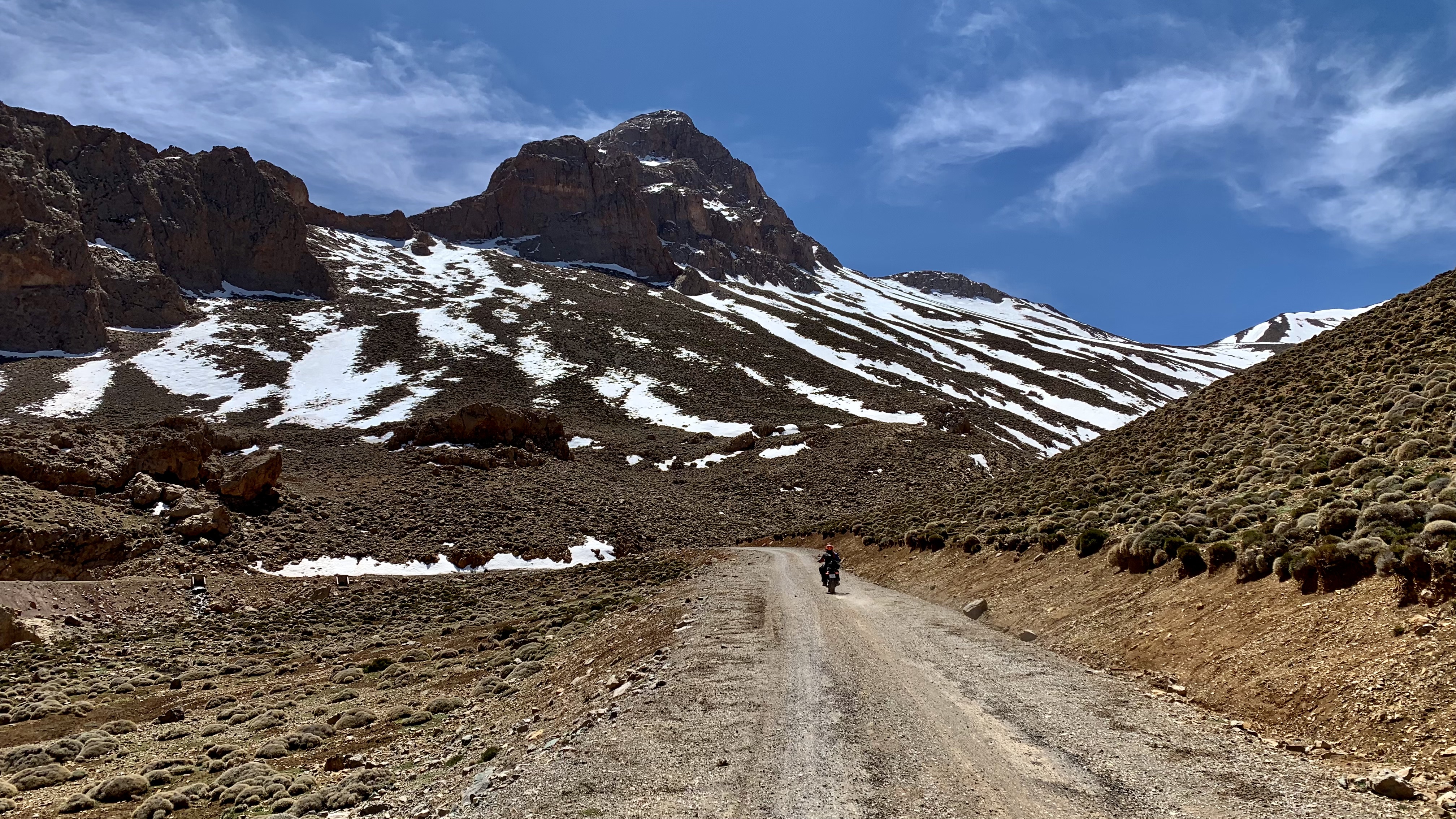 But soon after we set off, two travel bikes passed us, which suggested either they’d also just tried and failed to get anywhere, or they’d found a way over the watershed from the Dades valley. No map I had showed this trail and on satellite, tracks went all over and who knows what shape they’re in. In the end, with a couple of correct turns, we managed to span a little known 50-km off-road crossing of the High Atlas back to the Dades valley, peaking at over 3000m.