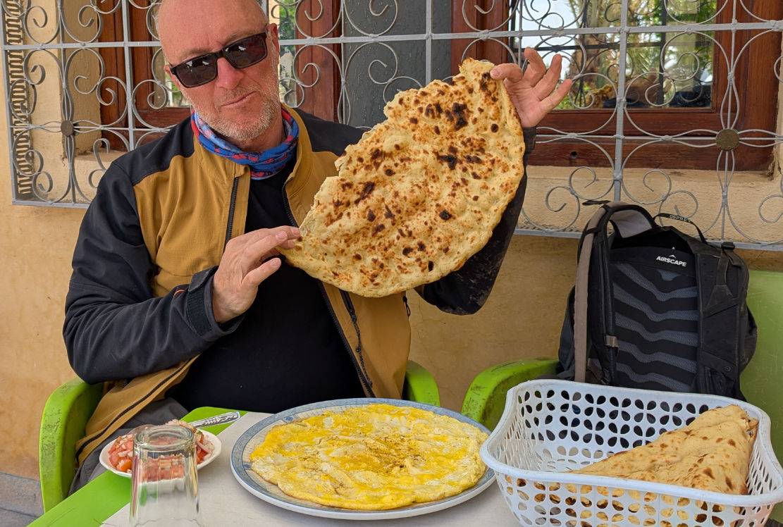Near Skoura, we could not fail to pop into the Inov roadhouse for a tafernout flatbread and omelette. That done, we swung north towards Amezri, reversing Route H3 which I’d not done since 2019 on my old Himalayan 411. I had a feeling they’d since linked the road along the gorge to Ait Hamza (H3KM126). Turns out I was wrong: they’ve extended it a bit, but it still involves a short stretch of flood-prone riverbed, as well as some precipitous tracks carved out of the cliff or on top of landslides.