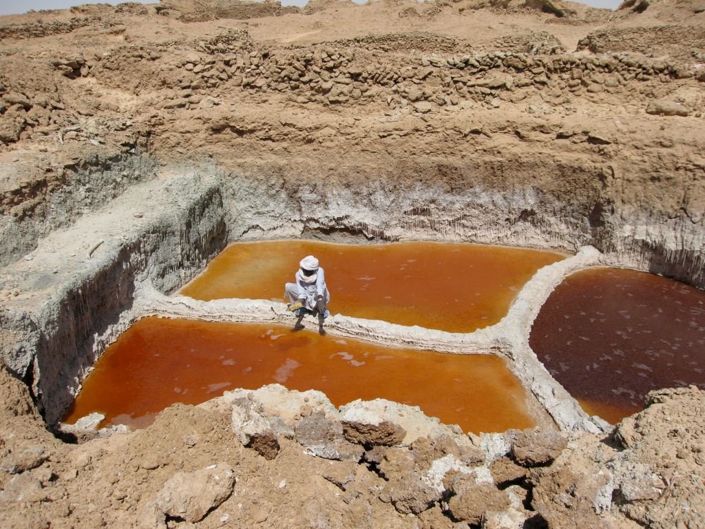 The landscape of the Kaouar was a bit grubby for my liking. We dropped into the salt works north of Dirkou where natron salt was mined. I noticed Madougou took some with his chewing tobacco, as they do in these parts. By the time we got to Yeguebba – the northern end of the Kaouar escarpment – the colour of the sand was a pleasingly orange again. We stopped to collect some firewood (there’s plenty of firewood here and masses in the Aïr) and drove across to a soak where the last car mired. What a mess, the quicksands wobbled like jelly and it makes you appreciate how easy and clean dry desert sand is to get out of. But with sand plates and a tow, the car was out and we spent the night nearby in the rocks where a fennec (desert fox, sort of) popped in for a visit. Since Bilma it had become clear our drivers were getting tired and probably anxious at being out on the far side of the Tenere in their old bangers. Their banter became restrained and you could see they longed to be back in their own country. We were having an easy time of course, waited on hand and foot and with nothing to worry about other than, for some, grabbing the best camp spot for the night. I couldn’t join in the evening chatter but it didn’t bother me, though I can now say ‘schpoon’ in German. Anyway, with time to myself I had a fresh batch of hare-brained schemes to nurture through their delicate development stage. Years ago, I recall reading in the Sahara Handbook about the importance of finding Pic Zumri to get to Seguedine from the north and now, there it was and the village laid out in the dip below. Here, the Adadez truck piste from Achegour splits, heading northeast behind the Djado plateau for Tumu and Libya or even east for Chad – a long closed route. Following a visit to Seguedine’s checkpoints, multi-coloured salines, and some gentle bartering with the wily Tubu women, we set off northwest across stony plains, passing petrified wood, the landmark of Oleki peak, and stopping for lunch at Sara ‘oasis‘. A hot wind was blowing from the southwest today, hazing the sky and raising the temperature to the high 30s. But lunch with Suntours was never less than a shady two-hour siesta, finished off with three glasses of ‘chai’. On this occasion Abdullai resoldered his burst radiator on the fire. Earlier, I noticed he’d tried to use clay dust as we’d done in Algeria years ago. I can report that bodge is no less effective at the hands of a wizened Tuareg desert driver than in mine… Hans was a great guide and had a good way of melting the ice at checkpoints by bringing photos from previous visits (this was still the camera film era). At the Chirfa control post, where the guys in their football kit always have a gun close by, the photos caused much delight, as they did in Chirfa village where we picked up some water and veggies from the garden. All through this trip it was clear that Suntours has developed a close rapport with many communities and individuals over the years. At many places Hans discreetly handed over medicaments to the village pharmacy (eye drops and aspirins were much in demand).