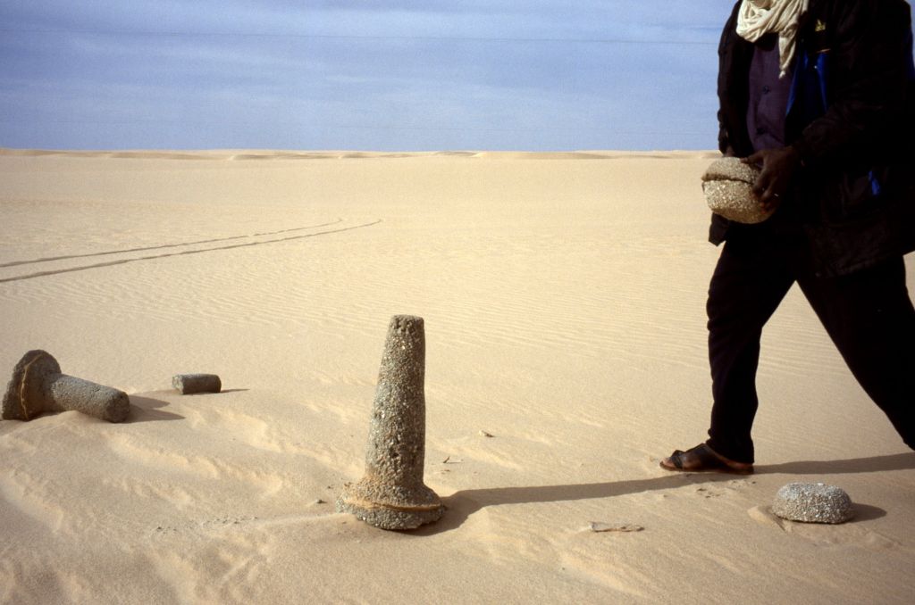 Hans, always energetically scanning the sands, found me an amazing rod of fulgarite in the dunes: a brittle, pencil-thin tube of petrified sand caused by a lightning strike. Since I first found some on the edge of Algeria’s Oriental Erg years ago (without then knowing what it was), this stuff has always amazed me: lightning turned into stone: a true wonder of nature. Walking back from a dune summit I found Hans’ spot and excavated another slender undisturbed twig over half a metre long. Who knows how deep it went.