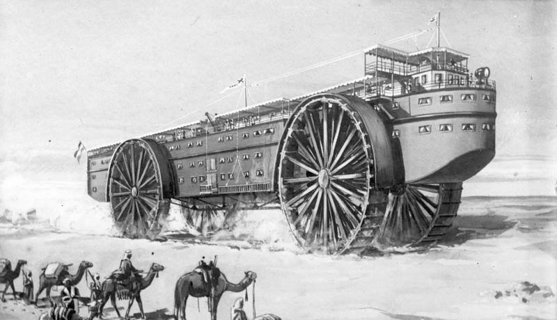 In the Edwardian era of luxurious, steam powered ocean liners, why not a desert liner to tame the vast sand oceans of Sahara? Like something from a Jules Verne novel, giant traction wheels would glide over the sands while desert tribesmen looked on in awe. This one never got beyond the drawing board, but today massively overloaded gros porteurs (left) from the pre-electronic 1980s diesel apogee still grind across the desert sands.