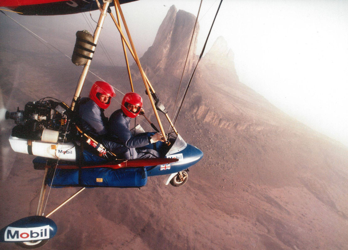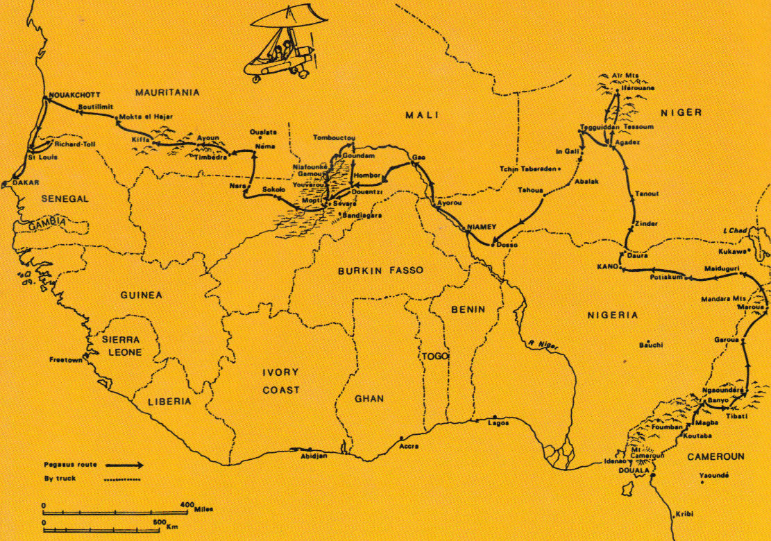 In 1988 prolific adventure travel writer Christina Dodwell teamed up with experienced microlight pilot David Young (recently back from a close shave in Nepal) to fly 7000 miles in a Pagasus XL from Cameroon to the Atlantic in what was still the pioneering era of microlighting. I knew of it but never read this one; it’s not a trans-Sahara, more of a Sahel traverse via the Aïr mountains and Timbuktu. From the back cover map it looks like they followed roads and main tracks for navigation, maybe due to range and landing issues. Luckily they didn’t do an Icarus and all ended well in Dakar four months later. There’s a book of course (right), one of Dodwell’s many which is widely available online.