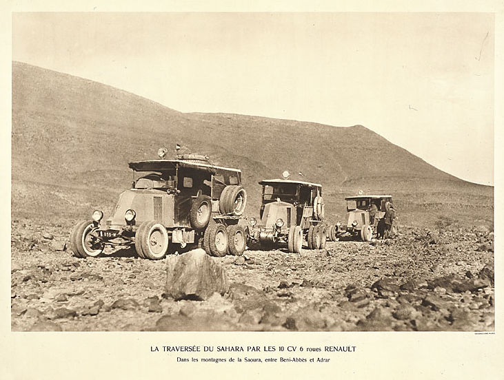 Competitor Renault’s solution to the traction problem was the 6×4 10CV Type MH featuring doubled wheels rubber and twin rear axles. Nicknamed ‘le douze pneus‘ (not really ;-), Renault trounced Citroen’s trans Sahara expedition of 1922 with a full, 23,000-mile trans Africa in 1925, the first cars to cross the continent.